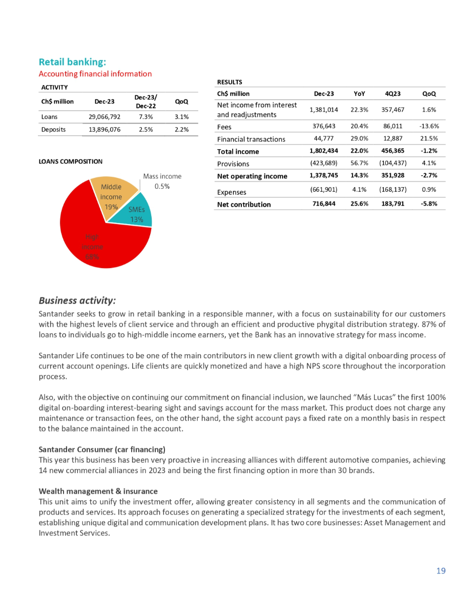 Retail banking: Accounting financial information 19 ACTIVITY QoQ Dec - 23/ Dec - 22 Dec - 23 Ch$ million 3.1% 7.3% 29,066,792 Loans 2.2% 2.5% 13,896,076 Deposits LOANS COMPOSITION Business activity : Santander seeks to grow in retail banking in a responsible manner, with a focus on sustainability for our customers with the highest levels of client service and through an efficient and productive phygital distribution strategy . 87 % of loans to individuals go to high - middle income earners, yet the Bank has an innovative strategy for mass income . Santander Life continues to be one of the main contributors in new client growth with a digital onboarding process of current account openings . Life clients are quickly monetized and have a high NPS score throughout the incorporation process . Also, with the objective on continuing our commitment on financial inclusion, we launched “Más Lucas” the first 100 % digital on - boarding interest - bearing sight and savings account for the mass market . This product does not charge any maintenance or transaction fees, on the other hand, the sight account pays a fixed rate on a monthly basis in respect to the balance maintained in the account . Santander Consumer (car financing) This year this business has been very proactive in increasing alliances with different automotive companies, achieving 14 new commercial alliances in 2023 and being the first financing option in more than 30 brands . Wealth management & insurance This unit aims to unify the investment offer, allowing greater consistency in all segments and the communication of products and services . Its approach focuses on generating a specialized strategy for the investments of each segment, establishing unique digital and communication development plans . It has two core businesses : Asset Management and Investment Services . RESULTS QoQ 4Q23 YoY Dec - 23 Ch$ million 1.6% 357,467 22.3% 1,381,014 Net income from interest and readjustments - 13.6% 86,011 20.4% 376,643 Fees 21.5% 12,887 29.0% 44,777 Financial transactions - 1.2% 456,365 22.0% 1,802,434 Total income 4.1% (104,437) 56.7% (423,689) Provisions - 2.7% 351,928 14.3% 1,378,745 Net operating income 0.9% (168,137) 4.1% (661,901) Expenses - 5.8% 183,791 25.6% 716,844 Net contribution