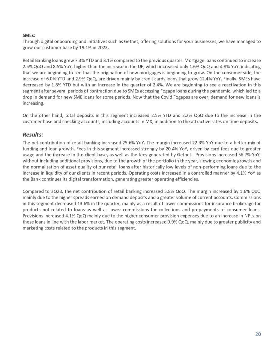 20 SMEs: Through digital onboarding and initiatives such as Getnet, offering solutions for your businesses, we have managed to grow our customer base by 19 . 1 % in 2023 . Retail Banking loans grew 7 . 3 % YTD and 3 . 1 % compared to the previous quarter . Mortgage loans continued to increase 2 . 5 % QoQ and 8 . 5 % YoY, higher than the increase in the UF, which increased only 1 . 6 % QoQ and 4 . 8 % YoY, indicating that we are beginning to see that the origination of new mortgages is beginning to grow . On the consumer side, the increase of 6 . 0 % YTD and 2 . 9 % QoQ, are driven mainly by credit cards loans that grow 12 . 4 % YoY . Finally, SMEs have decreased by 1 . 8 % YTD but with an increase in the quarter of 2 . 4 % . We are beginning to see a reactivation in this segment after several periods of contraction due to SMEs accessing Fogape loans during the pandemic, which led to a drop in demand for new SME loans for some periods . Now that the Covid Fogapes are over, demand for new loans is increasing . On the other hand, total deposits in this segment increased 2 . 5 % YTD and 2 . 2 % QoQ due to the increase in the customer base and checking accounts, including accounts in MX, in addition to the attractive rates on time deposits . Results: The net contribution of retail banking increased 25 . 6 % YoY . The margin increased 22 . 3 % YoY due to a better mix of funding and loan growth . Fees in this segment increased strongly by 20 . 4 % YoY, driven by card fees due to greater usage and the increase in the client base, as well as the fees generated by Getnet . Provisions increased 56 . 7 % YoY, without including additional provisions, due to the growth of the portfolio in the year, slowing economic growth and the normalization of asset quality of our retail loans after historically low levels of non - performing loans due to the increase in liquidity of our clients in recent periods . Operating costs increased in a controlled manner by 4 . 1 % YoY as the Bank continues its digital transformation, generating greater operating efficiencies . Compared to 3 Q 23 , the net contribution of retail banking increased 5 . 8 % QoQ . The margin increased by 1 . 6 % QoQ mainly due to the higher spreads earned on demand deposits and a greater volume of current accounts . Commissions in this segment decreased 13 . 6 % in the quarter, mainly as a result of lower commissions for insurance brokerage for products not related to loans as well as lower commissions for collections and prepayments of consumer loans . Provisions increased 4 . 1 % QoQ mainly due to the higher consumer provision expenses due to an increase in NPLs on these loans in line with the labor market . The operating costs increased 0 . 9 % QoQ, mainly due to greater publicity and marketing costs related to the products in this segment .