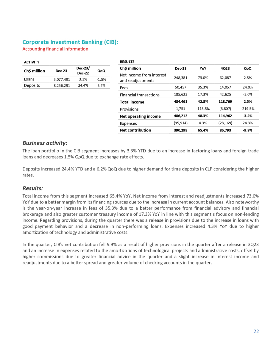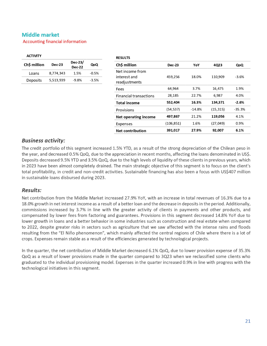 21 Middle market Accounting financial information ACTIVITY QoQ Dec - 23/ Dec - 22 Dec - 23 Ch$ million - 0.5% 1.5% 8,774,343 Loans - 3.5% - 9.8% 5,513,939 Deposits Business activity: The credit portfolio of this segment increased 1 . 5 % YTD, as a result of the strong depreciation of the Chilean peso in the year, and decreased 0 . 5 % QoQ, due to the appreciation in recent months, affecting the loans denominated in US $ . Deposits decreased 9 . 5 % YTD and 3 . 5 % QoQ, due to the high levels of liquidity of these clients in previous years, which in 2023 have been almost completely drained . The main strategic objective of this segment is to focus on the client's total profitability, in credit and non - credit activities . Sustainable financing has also been a focus with US $ 407 million in sustainable loans disbursed during 2023 . Results: Net contribution from the Middle Market increased 27 . 9 % YoY, with an increase in total revenues of 16 . 3 % due to a 18 . 0 % growth in net interest income as a result of a better loan and the decrease in deposits in the period . Additionally, commissions increased by 3 . 7 % in line with the greater activity of clients in payments and other products, and compensated by lower fees from factoring and guarantees . Provisions in this segment decreased 14 . 8 % YoY due to lower growth in loans and a better behavior in some industries such as construction and real estate when compared to 2022 , despite greater risks in sectors such as agriculture that we saw affected with the intense rains and floods resulting from the “El Niño phenomenon”, which mainly affected the central regions of Chile where there is a lot of crops . Expenses remain stable as a result of the efficiencies generated by technological projects . In the quarter, the net contribution of Middle Market decreased 6 . 1 % QoQ, due to lower provision expense of 35 . 3 % QoQ as a result of lower provisions made in the quarter compared to 3 Q 23 when we reclassified some clients who graduated to the individual provisioning model . Expenses in the quarter increased 0 . 9 % in line with progress with the technological initiatives in this segment . RESULTS QoQ 4Q23 YoY Dec - 23 Ch$ million - 3.6% 110,909 18.0% 459,256 Net income from interest and readjustments 1.9% 16,475 3.7% 64,964 Fees 4.0% 6,987 22.7% 28,185 Financial transactions - 2.6% 134,371 16.3% 552,404 Total income - 35.3% (15,315) - 14.8% (54,537) Provisions 4.1% 119,056 21.2% 497,867 Net operating income 0.9% (27,049) 1.6% (106,851) Expenses 6.1% 92,007 27.9% 391,017 Net contribution