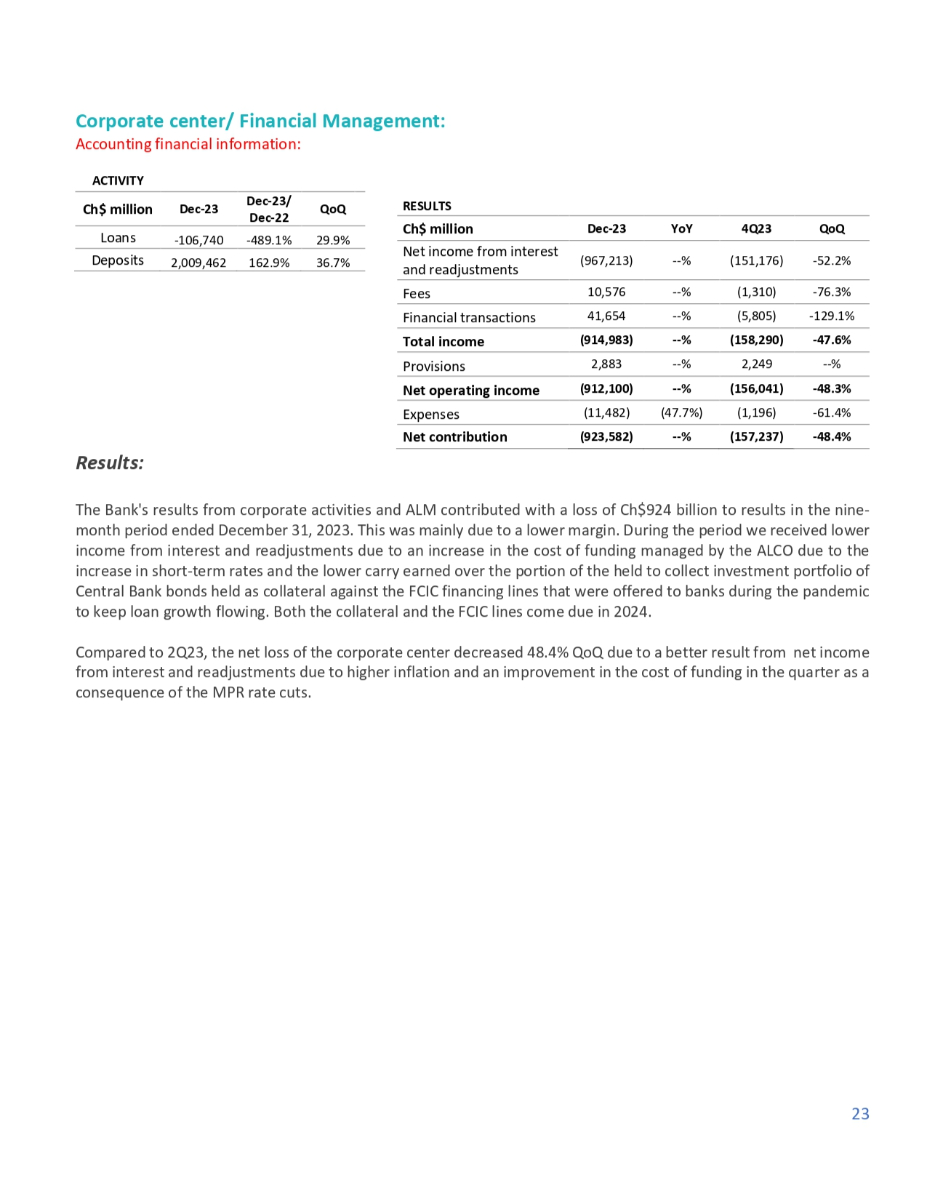 23 Corporate center/ Financial Management: Accounting financial information: Results: The Bank's results from corporate activities and ALM contributed with a loss of Ch $ 924 billion to results in the nine - month period ended December 31 , 2023 . This was mainly due to a lower margin . During the period we received lower income from interest and readjustments due to an increase in the cost of funding managed by the ALCO due to the increase in short - term rates and the lower carry earned over the portion of the held to collect investment portfolio of Central Bank bonds held as collateral against the FCIC financing lines that were offered to banks during the pandemic to keep loan growth flowing . Both the collateral and the FCIC lines come due in 2024 . Compared to 2 Q 23 , the net loss of the corporate center decreased 48 . 4 % QoQ due to a better result from net income from interest and readjustments due to higher inflation and an improvement in the cost of funding in the quarter as a consequence of the MPR rate cuts . ACTIVITY QoQ Dec - 23/ Dec - 22 Dec - 23 Ch$ million 29.9% - 489.1% - 106,740 Loans 36.7% 162.9% 2,009,462 Deposits RESULTS QoQ 4Q23 YoY Dec - 23 Ch$ million - 52.2% (151,176) -- % (967,213) Net income from interest and readjustments - 76.3% (1,310) -- % 10,576 Fees - 129.1% (5,805) -- % 41,654 Financial transactions - 47.6% (158,290) -- % (914,983) Total income -- % 2,249 -- % 2,883 Provisions - 48.3% (156,041) -- % (912,100) Net operating income - 61.4% (1,196) (47.7%) (11,482) Expenses - 48.4% (157,237) -- % (923,582) Net contribution