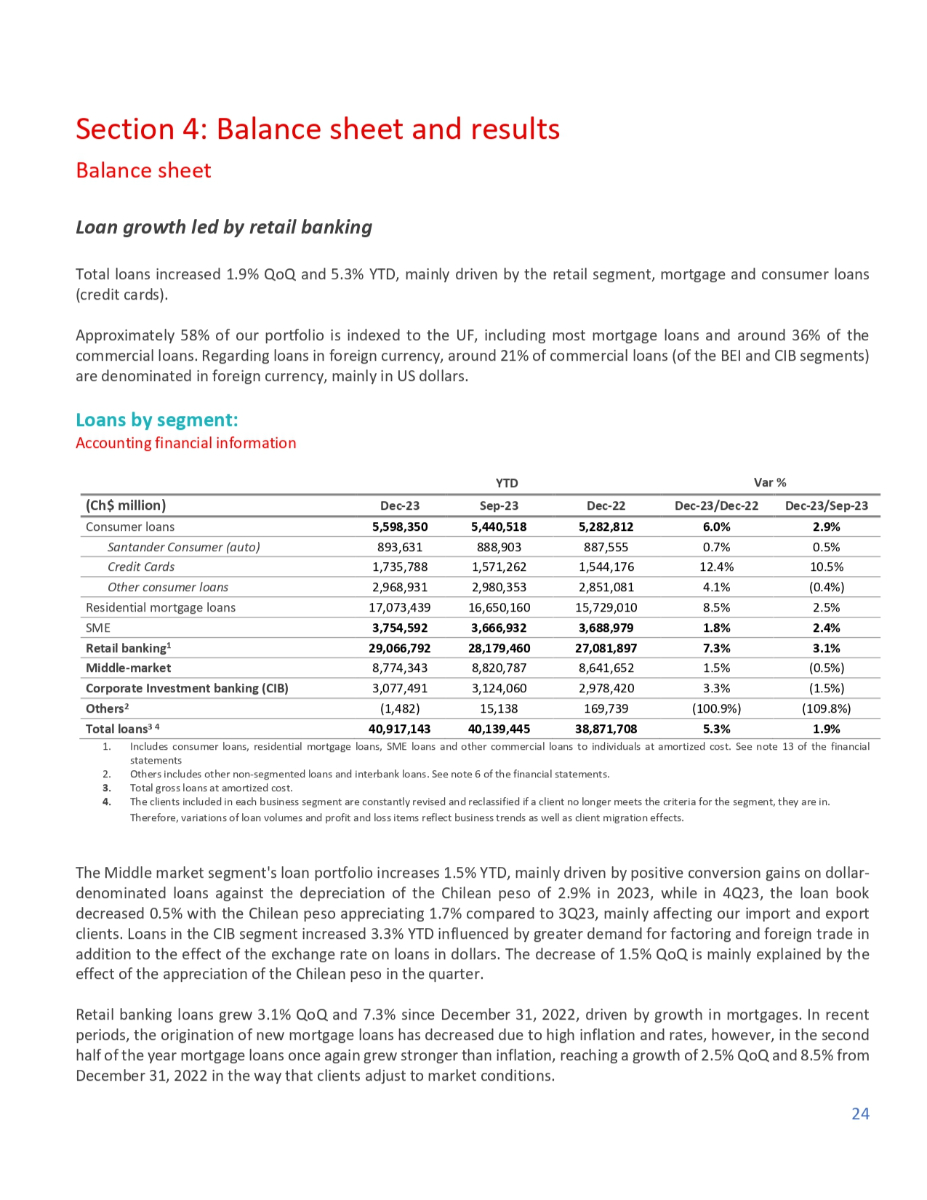 24 Section 4: Balance sheet and results Balance sheet Loan growth led by retail banking Total loans increased 1 . 9 % QoQ and 5 . 3 % YTD, mainly driven by the retail segment, mortgage and consumer loans (credit cards) . Approximately 58 % of our portfolio is indexed to the UF, including most mortgage loans and around 36 % of the commercial loans . Regarding loans in foreign currency, around 21 % of commercial loans (of the BEI and CIB segments) are denominated in foreign currency, mainly in US dollars . Loans by segment : Accounting financial information Var % YTD Dec - 23/Sep - 23 Dec - 23/Dec - 22 Dec - 22 Sep - 23 Dec - 23 (Ch$ million) 2.9% 6.0% 5,282,812 5,440,518 5,598,350 Consumer loans 0.5% 0.7% 887,555 888,903 893,631 Santander Consumer (auto) 10.5% 12.4% 1,544,176 1,571,262 1,735,788 Credit Cards (0.4%) 4.1% 2,851,081 2,980,353 2,968,931 Other consumer loans 2.5% 8.5% 15,729,010 16,650,160 17,073,439 Residential mortgage loans 2.4% 1.8% 3,688,979 3,666,932 3,754,592 SME 3.1% 7.3% 27,081,897 28,179,460 29,066,792 Retail banking 1 (0.5%) 1.5% 8,641,652 8,820,787 8,774,343 Middle - market (1.5%) 3.3% 2,978,420 3,124,060 3,077,491 Corporate Investment banking (CIB) (109.8%) (100.9%) 169,739 15,138 (1,482) Others 2 1.9% 5.3% 38,871,708 40,139,445 40,917,143 Total loans 3 4 1. Includes consumer loans, residential mortgage loans, SME loans and other commercial loans to individuals at amortized cost. See note 13 of the financial statements 2. Others includes other non - segmented loans and interbank loans. See note 6 of the financial statements. 3. Total gross loans at amortized cost. 4. The clients included in each business segment are constantly revised and reclassified if a client no longer meets the criteria for the segment, they are in. Therefore, variations of loan volumes and profit and loss items reflect business trends as well as client migration effects. The Middle market segment's loan portfolio increases 1 . 5 % YTD, mainly driven by positive conversion gains on dollar - denominated loans against the depreciation of the Chilean peso of 2 . 9 % in 2023 , while in 4 Q 23 , the loan book decreased 0 . 5 % with the Chilean peso appreciating 1 . 7 % compared to 3 Q 23 , mainly affecting our import and export clients . Loans in the CIB segment increased 3 . 3 % YTD influenced by greater demand for factoring and foreign trade in addition to the effect of the exchange rate on loans in dollars . The decrease of 1 . 5 % QoQ is mainly explained by the effect of the appreciation of the Chilean peso in the quarter . Retail banking loans grew 3 . 1 % QoQ and 7 . 3 % since December 31 , 2022 , driven by growth in mortgages . In recent periods, the origination of new mortgage loans has decreased due to high inflation and rates, however, in the second half of the year mortgage loans once again grew stronger than inflation, reaching a growth of 2 . 5 % QoQ and 8 . 5 % from December 31 , 2022 in the way that clients adjust to market conditions .