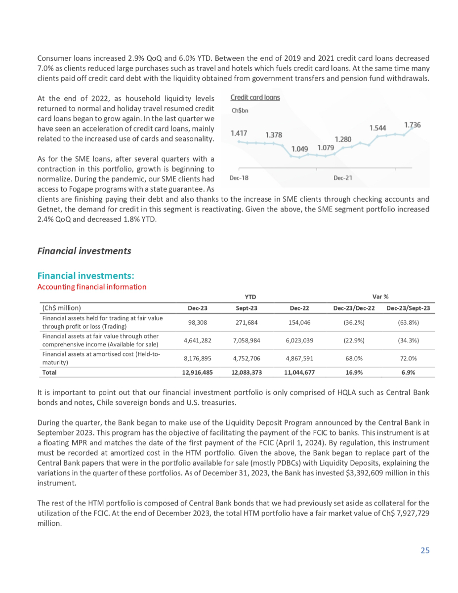 Consumer loans increased 2 . 9 % QoQ and 6 . 0 % YTD . Between the end of 2019 and 2021 credit card loans decreased 7 . 0 % as clients reduced large purchases such as travel and hotels which fuels credit card loans . At the same time many clients paid off credit card debt with the liquidity obtained from government transfers and pension fund withdrawals . At the end of 2022 , as household liquidity levels returned to normal and holiday travel resumed credit card loans began to grow again . In the last quarter we have seen an acceleration of credit card loans, mainly related to the increased use of cards and seasonality . As for the SME loans, after several quarters with a contraction in this portfolio, growth is beginning to normalize . During the pandemic, our SME clients had access to Fogape programs with a state guarantee . As clients are finishing paying their debt and also thanks to the increase in SME clients through checking accounts and Getnet, the demand for credit in this segment is reactivating . Given the above, the SME segment portfolio increased 2 . 4 % QoQ and decreased 1 . 8 % YTD . Financial investments Financial investments : Accounting financial information Var % YTD Dec - 23/Sept - 23 Dec - 23/Dec - 22 Dec - 22 Sept - 23 Dec - 23 (Ch$ million) (63.8%) (36.2%) 154,046 271,684 98,308 Financial assets held for trading at fair value through profit or loss (Trading) (34.3%) (22.9%) 6,023,039 7,058,984 4,641,282 Financial assets at fair value through other comprehensive income (Available for sale) 72.0% 68.0% 4,867,591 4,752,706 8,176,895 Financial assets at amortised cost (Held - to - maturity) 6.9% 16.9% 11,044,677 12,083,373 12,916,485 Total It is important to point out that our financial investment portfolio is only comprised of HQLA such as Central Bank bonds and notes, Chile sovereign bonds and U . S . treasuries . During the quarter, the Bank began to make use of the Liquidity Deposit Program announced by the Central Bank in September 2023 . This program has the objective of facilitating the payment of the FCIC to banks . This instrument is at a floating MPR and matches the date of the first payment of the FCIC (April 1 , 2024 ) . By regulation, this instrument must be recorded at amortized cost in the HTM portfolio . Given the above, the Bank began to replace part of the Central Bank papers that were in the portfolio available for sale (mostly PDBCs) with Liquidity Deposits, explaining the variations in the quarter of these portfolios . As of December 31 , 2023 , the Bank has invested $ 3 , 392 , 609 million in this instrument . The rest of the HTM portfolio is composed of Central Bank bonds that we had previously set aside as collateral for the utilization of the FCIC . At the end of December 2023 , the total HTM portfolio have a fair market value of Ch $ 7 , 927 , 729 million . 25