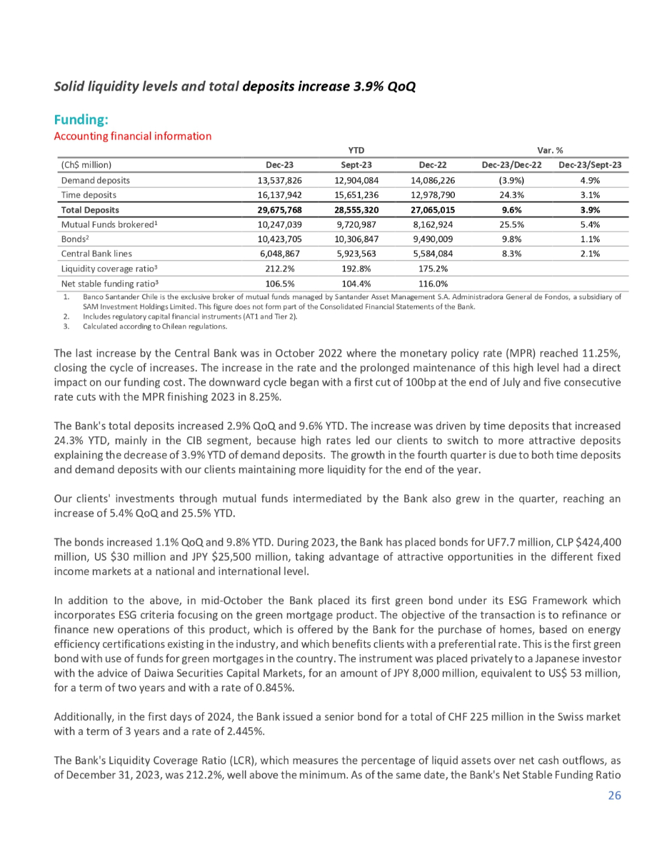 26 Solid liquidity levels and total deposits increase 3.9% QoQ Funding: Accounting financial information Var. % YTD Dec - 23/Sept - 23 Dec - 23/Dec - 22 Dec - 22 Sept - 23 Dec - 23 (Ch$ million) 4.9% (3.9%) 14,086,226 12,904,084 13,537,826 Demand deposits 3.1% 24.3% 12,978,790 15,651,236 16,137,942 Time deposits 3.9% 9.6% 27,065,015 28,555,320 29,675,768 Total Deposits 5.4% 25.5% 8,162,924 9,720,987 10,247,039 Mutual Funds brokered 1 1.1% 9.8% 9,490,009 10,306,847 10,423,705 Bonds 2 2.1% 8.3% 5,584,084 5,923,563 6,048,867 Central Bank lines 175.2% 192.8% 212.2% Liquidity coverage ratio 3 116.0% 104.4% 106.5% Net stable funding ratio 3 1. Banco Santander Chile is the exclusive broker of mutual funds managed by Santander Asset Management S.A. Administradora General de Fondos, a subsidiary of SAM Investment Holdings Limited. This figure does not form part of the Consolidated Financial Statements of the Bank. 2. Includes regulatory capital financial instruments (AT1 and Tier 2). 3. Calculated according to Chilean regulations. The last increase by the Central Bank was in October 2022 where the monetary policy rate (MPR) reached 11 . 25 % , closing the cycle of increases . The increase in the rate and the prolonged maintenance of this high level had a direct impact on our funding cost . The downward cycle began with a first cut of 100 bp at the end of July and five consecutive rate cuts with the MPR finishing 2023 in 8 . 25 % . The Bank's total deposits increased 2 . 9 % QoQ and 9 . 6 % YTD . The increase was driven by time deposits that increased 24 . 3 % YTD, mainly in the CIB segment, because high rates led our clients to switch to more attractive deposits explaining the decrease of 3 . 9 % YTD of demand deposits . The growth in the fourth quarter is due to both time deposits and demand deposits with our clients maintaining more liquidity for the end of the year . Our clients' investments through mutual funds intermediated by the Bank also grew in the quarter, reaching an increase of 5 . 4 % QoQ and 25 . 5 % YTD . The bonds increased 1 . 1 % QoQ and 9 . 8 % YTD . During 2023 , the Bank has placed bonds for UF 7 . 7 million, CLP $ 424 , 400 million, US $ 30 million and JPY $ 25 , 500 million, taking advantage of attractive opportunities in the different fixed income markets at a national and international level . In addition to the above, in mid - October the Bank placed its first green bond under its ESG Framework which incorporates ESG criteria focusing on the green mortgage product . The objective of the transaction is to refinance or finance new operations of this product, which is offered by the Bank for the purchase of homes, based on energy efficiency certifications existing in the industry, and which benefits clients with a preferential rate . This is the first green bond with use of funds for green mortgages in the country . The instrument was placed privately to a Japanese investor with the advice of Daiwa Securities Capital Markets, for an amount of JPY 8 , 000 million, equivalent to US $ 53 million, for a term of two years and with a rate of 0 . 845 % . Additionally, in the first days of 2024 , the Bank issued a senior bond for a total of CHF 225 million in the Swiss market with a term of 3 years and a rate of 2 . 445 % . The Bank's Liquidity Coverage Ratio (LCR), which measures the percentage of liquid assets over net cash outflows, as of December 31 , 2023 , was 212 . 2 % , well above the minimum . As of the same date, the Bank's Net Stable Funding Ratio