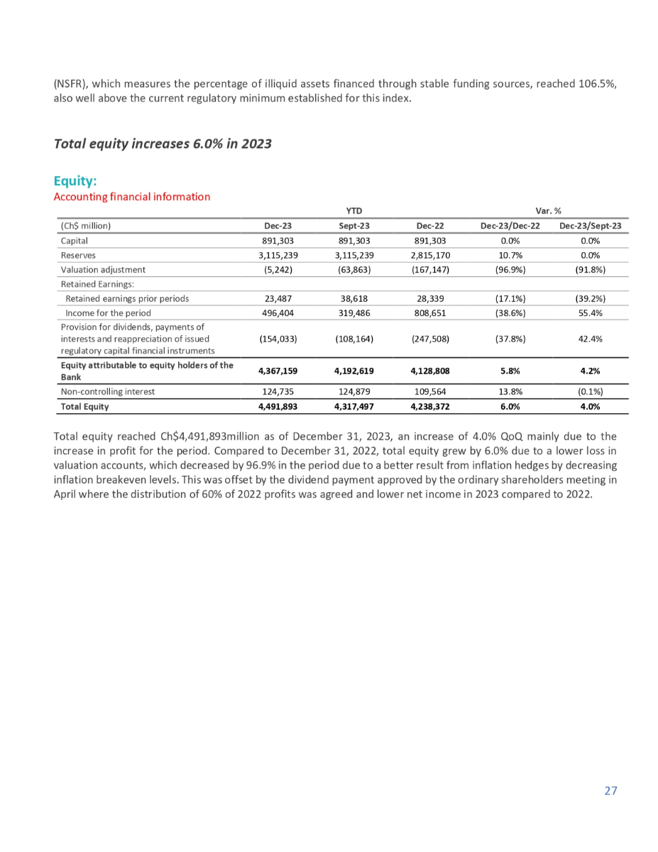 27 (NSFR), which measures the percentage of illiquid assets financed through stable funding sources, reached 106.5%, also well above the current regulatory minimum established for this index. Total equity increases 6.0% in 2023 Equity: Accounting financial information Var. % YTD Dec - 23/Sept - 23 Dec - 23/Dec - 22 Dec - 22 Sept - 23 Dec - 23 (Ch$ million) 0.0% 0.0% 891,303 891,303 891,303 Capital 0.0% 10.7% 2,815,170 3,115,239 3,115,239 Reserves (91.8%) (96.9%) (167,147) (63,863) (5,242) Valuation adjustment Retained Earnings: (39.2%) (17.1%) 28,339 38,618 23,487 Retained earnings prior periods 55.4% (38.6%) 808,651 319,486 496,404 Income for the period 42.4% (37.8%) (247,508) (108,164) (154,033) Provision for dividends, payments of interests and reappreciation of issued regulatory capital financial instruments 4.2% 5.8% 4,128,808 4,192,619 4,367,159 Equity attributable to equity holders of the Bank (0.1%) 13.8% 109,564 124,879 124,735 Non - controlling interest 4.0% 6.0% 4,238,372 4,317,497 4,491,893 Total Equity Total equity reached Ch $ 4 , 491 , 893 million as of December 31 , 2023 , an increase of 4 . 0 % QoQ mainly due to the increase in profit for the period . Compared to December 31 , 2022 , total equity grew by 6 . 0 % due to a lower loss in valuation accounts, which decreased by 96 . 9 % in the period due to a better result from inflation hedges by decreasing inflation breakeven levels . This was offset by the dividend payment approved by the ordinary shareholders meeting in April where the distribution of 60 % of 2022 profits was agreed and lower net income in 2023 compared to 2022 .