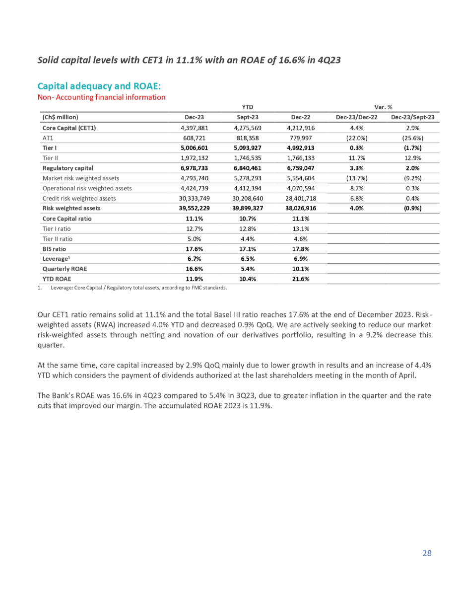 28 Solid capital levels with CET1 in 11.1% with an ROAE of 16.6% in 4Q23 Capital adequacy and ROAE: Non - Accounting financial information Var. % YTD Dec - 23/Sept - 23 Dec - 23/Dec - 22 Dec - 22 Sept - 23 Dec - 23 (Ch$ million) 2.9% 4.4% 4,212,916 4,275,569 4,397,881 Core Capital (CET1) (25.6%) (22.0%) 779,997 818,358 608,721 AT1 (1.7%) 0.3% 4,992,913 5,093,927 5,006,601 Tier I 12.9% 11.7% 1,766,133 1,746,535 1,972,132 Tier II 2.0% 3.3% 6,759,047 6,840,461 6,978,733 Regulatory capital (9.2%) (13.7%) 5,554,604 5,278,293 4,793,740 Market risk weighted assets 0.3% 8.7% 4,070,594 4,412,394 4,424,739 Operational risk weighted assets 0.4% 6.8% 28,401,718 30,208,640 30,333,749 Credit risk weighted assets (0.9%) 4.0% 38,026,916 39,899,327 39,552,229 Risk weighted assets 11.1% 10.7% 11.1% Core Capital ratio 13.1% 12.8% 12.7% Tier I ratio 4.6% 4.4% 5.0% Tier II ratio 17.8% 17.1% 17.6% BIS ratio 6.9% 6.5% 6.7% Leverage 1 10.1% 5.4% 16.6% Quarterly ROAE 21.6% 10.4% 11.9% YTD ROAE 1. Leverage: Core Capital / Regulatory total assets, according to FMC standards. Our CET 1 ratio remains solid at 11 . 1 % and the total Basel III ratio reaches 17 . 6 % at the end of December 2023 . Risk - weighted assets (RWA) increased 4 . 0 % YTD and decreased 0 . 9 % QoQ . We are actively seeking to reduce our market risk - weighted assets through netting and novation of our derivatives portfolio, resulting in a 9 . 2 % decrease this quarter . At the same time, core capital increased by 2 . 9 % QoQ mainly due to lower growth in results and an increase of 4 . 4 % YTD which considers the payment of dividends authorized at the last shareholders meeting in the month of April . The Bank's ROAE was 16 . 6 % in 4 Q 23 compared to 5 . 4 % in 3 Q 23 , due to greater inflation in the quarter and the rate cuts that improved our margin . The accumulated ROAE 2023 is 11 . 9 % .