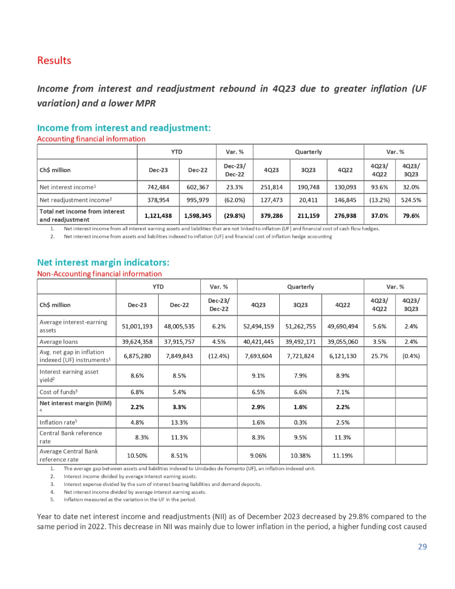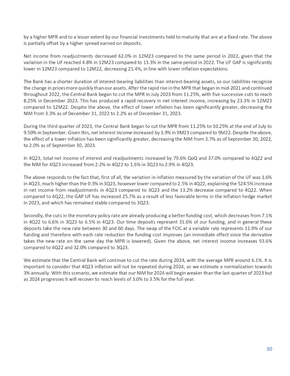 30 by a higher MPR and to a lesser extent by our financial investments held to maturity that are at a fixed rate . The above is partially offset by a higher spread earned on deposits . Net income from readjustments decreased 62 . 0 % in 12 M 23 compared to the same period in 2022 , given that the variation in the UF reached 4 . 8 % in 12 M 23 compared to 13 . 3 % in the same period in 2022 . The UF GAP is significantly lower in 12 M 23 compared to 12 M 22 , decreasing 21 . 4 % , in line with lower inflation expectations . The Bank has a shorter duration of interest - bearing liabilities than interest - bearing assets, so our liabilities recognize the change in prices more quickly than our assets . After the rapid rise in the MPR that began in mid - 2021 and continued throughout 2022 , the Central Bank began to cut the MPR in July 2023 from 11 . 25 % , with five successive cuts to reach 8 . 25 % in December 2023 . This has produced a rapid recovery in net interest income, increasing by 23 . 3 % in 12 M 23 compared to 12 M 22 . Despite the above, the effect of lower inflation has been significantly greater, decreasing the NIM from 3 . 3 % as of December 31 , 2022 to 2 . 2 % as of December 31 , 2023 . During the third quarter of 2023 , the Central Bank began to cut the MPR from 11 . 25 % to 10 . 25 % at the end of July to 9 . 50 % in September . Given this, net interest income increased by 3 . 9 % in 9 M 23 compared to 9 M 22 . Despite the above, the effect of a lower inflation has been significantly greater, decreasing the NIM from 3 . 7 % as of September 30 , 2022 , to 2 . 0 % as of September 30 , 2023 . In 4 Q 23 , total net income of interest and readjustments increased by 79 . 6 % QoQ and 37 . 0 % compared to 4 Q 22 and the NIM for 4 Q 23 increased from 2 . 2 % in 4 Q 22 to 1 . 6 % in 3 Q 23 to 2 . 9 % in 4 Q 23 . The above responds to the fact that, first of all, the variation in inflation measured by the variation of the UF was 1 . 6 % in 4 Q 23 , much higher than the 0 . 3 % in 3 Q 23 , however lower compared to 2 . 5 % in 4 Q 22 , explaining the 524 . 5 % increase in net income from readjustments in 4 Q 23 compared to 3 Q 23 and the 13 . 2 % decrease compared to 4 Q 22 . When compared to 4 Q 22 , the GAP UF has increased 25 . 7 % as a result of less favorable terms in the inflation hedge market in 2023 , and which has remained stable compared to 3 Q 23 . Secondly, the cuts in the monetary policy rate are already producing a better funding cost, which decreases from 7 . 1 % in 4 Q 22 to 6 . 6 % in 3 Q 23 to 6 . 5 % in 4 Q 23 . Our time deposits represent 31 . 6 % of our funding, and in general these deposits take the new rate between 30 and 60 days . The swap of the FCIC at a variable rate represents 11 . 9 % of our funding and therefore with each rate reduction the funding cost improves (an immediate effect since the derivative takes the new rate on the same day the MPR is lowered) . Given the above, net interest income increases 93 . 6 % compared to 4 Q 22 and 32 . 0 % compared to 3 Q 23 . We estimate that the Central Bank will continue to cut the rate during 2024 , with the average MPR around 6 . 1 % . It is important to consider that 4 Q 23 inflation will not be repeated during 2024 , so we estimate a normalization towards 3 % annually . With this scenario, we estimate that our NIM for 2024 will begin weaker than the last quarter of 2023 but as 2024 progresses it will recover to reach levels of 3 . 0 % to 3 . 5 % for the full year .