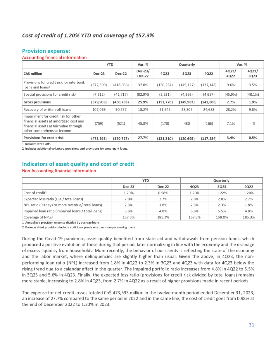 31 Cost of credit of 1.20% YTD and coverage of 157.3% Provision expense: Accounting financial information Var. % Quarterly Var. % YTD 4Q23/ 3Q23 4Q23/ 4Q22 4Q22 3Q23 4Q23 Dec - 23/ Dec - 22 Dec - 22 Dec - 23 Ch$ million 3.5% 9.6% (137,148) (145,127) (150,254) 37.0% (418,066) (572,590) Provisions for credit risk for interbank loans and loans 1 (48.1%) (45.9%) (4,657) (4,856) (2,521) (82.9%) (42,717) (7,312) Special provisions for credit risk 2 1.9% 7.7% (141,806) (149,983) (152,776) 25.9% (460,783) (579,903) Gross provisions 9.8% 28.2% 24,688 28,807 31,643 18.2% 90,577 107,069 Recovery of written - off loans -- % 7.1% (166) 480 (178) 45.8% (521) (759) Impairment for credit risk for other financial assets at amortized cost and financial assets at fair value through other comprehensive income 0.5% 3.4% (117,284) (120,695) (121,310) 27.7% (370,727) (473,593) Provisions for credit risk 1. Includes write - offs. 2. Includes additional voluntary provisions and provisions for contingent loans . Indicators of asset quality and cost of credit Non Accounting financial information 1. Annualized provision expense divided by average loans. 2. Balance sheet provisions include additional provisions over non - performing loans During the Covid - 19 pandemic, asset quality benefited from state aid and withdrawals from pension funds, which produced a positive evolution of these during that period, later normalizing in line with the economy and the drainage of excess liquidity from households . More recently, the behavior of our clients is reflecting the state of the economy and the labor market, where delinquencies are slightly higher than usual . Given the above, in 4 Q 23 , the non - performing loan ratio (NPL) increased from 1 . 8 % in 4 Q 22 to 2 . 3 % in 3 Q 23 and 4 Q 23 with data for 4 Q 23 below the rising trend due to a calendar effect in the quarter . The impaired portfolio ratio increases from 4 . 8 % in 4 Q 22 to 5 . 5 % in 3 Q 23 and 5 . 6 % in 4 Q 23 . Finally, the expected loss ratio (provisions for credit risk divided by total loans) remains more stable, increasing to 2 . 8 % in 4 Q 23 , from 2 . 7 % in 4 Q 22 as a result of higher provisions made in recent periods . The expense for net credit losses totaled Ch $ 473 , 593 million in the twelve - month period ended December 31 , 2023 , an increase of 27 . 7 % compared to the same period in 2022 and in the same line, the cost of credit goes from 0 . 98 % at the end of December 2022 to 1 . 20 % in 2023 . Quarterly YTD 4Q22 3Q23 4Q23 Dec - 22 Dec - 23 1.20% 1.22% 1.20% 0.98% 1.20% Cost of credit 1 2.7% 2.8% 2.8% 2.7% 2.8% Expected loss ratio (LLA / total loans) 1.8% 2.3% 2.3% 1.8% 2.3% NPL ratio (90 days or more overdue/ total loans) 4.8% 5.5% 5.6% 4.8% 5.6% Impaired loan ratio (impaired loans / total loans) 185.3% 158.0% 157.3% 185.3% 157.3% Coverage of NPLs 2