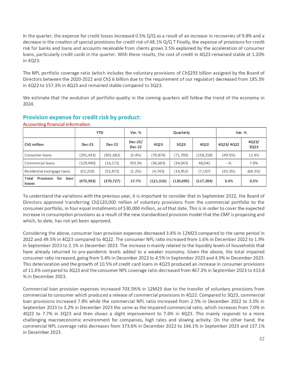 32 In the quarter, the expense for credit losses increased 0 . 5 % Q/Q as a result of an increase in recoveries of 9 . 8 % and a decrease in the creation of special provisions for credit risk of 48 . 1 % Q/Q T Finally, the expense of provisions for credit risk for banks and loans and accounts receivable from clients grows 3 . 5 % explained by the acceleration of consumer loans, particularly credit cards in the quarter . With these results, the cost of credit in 4 Q 23 remained stable at 1 . 20 % in 4 Q 23 . The NPL portfolio coverage ratio (which includes the voluntary provisions of Ch $ 293 billion assigned by the Board of Directors between the 2020 - 2022 and Ch $ 6 billion due to the requirement of our regulator) decreased from 185 . 3 % in 4 Q 22 to 157 . 3 % in 4 Q 23 and remained stable compared to 3 Q 23 . We estimate that the evolution of portfolio quality in the coming quarters will follow the trend of the economy in 2024 . Provision expense for credit risk by product : Accounting financial information Var. % Quarterly Var. % YTD 4Q23/ 3Q23 4Q23/ 4Q22 4Q22 3Q23 4Q23 Dec - 23/ Dec - 22 Dec - 22 Dec - 23 Ch$ million 11.4% (49.5%) (158,218) (71,700) (79,874) (3.4%) (301,682) (291,433) Consumer loans 7.8% -- % 48,041 (34,043) (36,693) 703.5% (16,172) (129,940) Commercial loans (68.3%) (33.3%) (7,107) (14,952) (4,743) (1.2%) (52,872) (52,220) Residential mortgage loans 0.5% 3.4% (117,284) (120,695) (121,310) 27.7% (370,727) (473,593) Total Provision for loan losses To understand the variations with the previous year, it is important to consider that in September 2022 , the Board of Directors approved transferring Ch $ 120 , 000 million of voluntary provisions from the commercial portfolio to the consumer portfolio, in four equal installments of $ 30 , 000 million, as of that date . This is in order to cover the expected increase in consumption provisions as a result of the new standardized provision model that the CMF is proposing and which, to date, has not yet been approved . Considering the above, consumer loan provision expenses decreased 3 . 4 % in 12 M 23 compared to the same period in 2022 and 49 . 5 % in 4 Q 23 compared to 4 Q 22 . The consumer NPL ratio increased from 1 . 6 % in December 2022 to 1 . 9 % in September 2023 to 2 . 1 % in December 2023 . The increase is mainly related to the liquidity levels of households that have already returned to pre - pandemic levels added to a weaker economy . Given the above, the total impaired consumer ratio increased, going from 3 . 4 % in December 2022 to 4 . 5 % in September 2023 and 4 . 9 % in December 2023 . This deterioration and the growth of 10 . 5 % of credit card loans in 4 Q 23 produced an increase in consumer provisions of 11 . 4 % compared to 3 Q 23 and the consumer NPL coverage ratio decreased from 467 . 3 % in September 2023 to 413 . 8 % in December 2023 . Commercial loan provision expenses increased 703 . 5 %% in 12 M 23 due to the transfer of voluntary provisions from commercial to consumer which produced a release of commercial provisions in 4 Q 22 . Compared to 3 Q 23 , commercial loan provisions increased 7 . 8 % while the commercial NPL ratio increased from 2 . 5 % in December 2022 to 3 . 0 % in September 2023 to 3 . 2 % in December 2023 the same as the impaired commercial ratio, which increases from 7 . 0 % in 4 Q 22 to 7 . 7 % in 3 Q 23 and then shows a slight improvement to 7 . 6 % in 4 Q 23 . This mainly responds to a more challenging macroeconomic environment for companies, high rates and slowing activity . On the other hand, the commercial NPL coverage ratio decreases from 173 . 6 % in December 2022 to 146 . 1 % in September 2023 and 137 . 1 % in December 2023 .