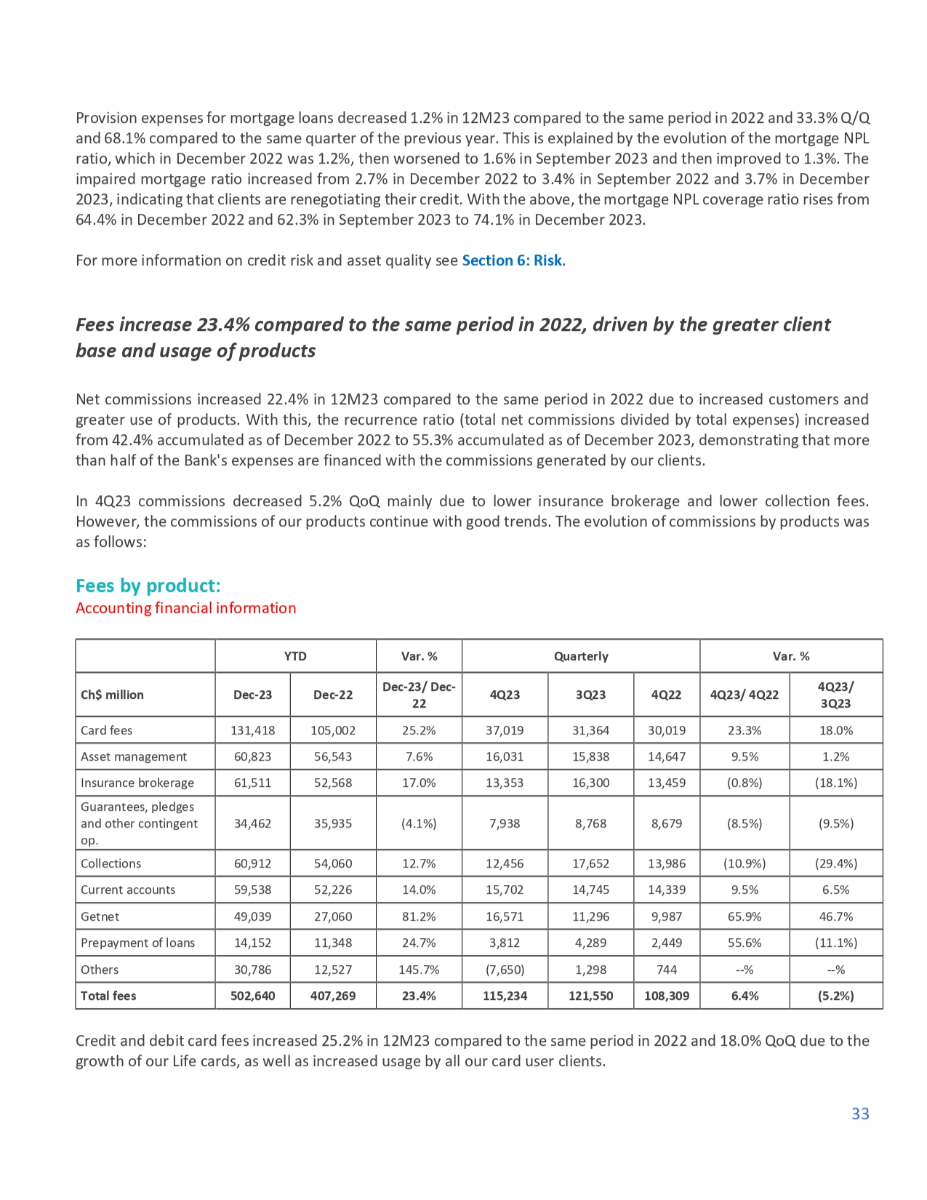 33 Provision expenses for mortgage loans decreased 1 . 2 % in 12 M 23 compared to the same period in 2022 and 33 . 3 % Q/Q and 68 . 1 % compared to the same quarter of the previous year . This is explained by the evolution of the mortgage NPL ratio, which in December 2022 was 1 . 2 % , then worsened to 1 . 6 % in September 2023 and then improved to 1 . 3 % . The impaired mortgage ratio increased from 2 . 7 % in December 2022 to 3 . 4 % in September 2022 and 3 . 7 % in December 2023 , indicating that clients are renegotiating their credit . With the above, the mortgage NPL coverage ratio rises from 64 . 4 % in December 2022 and 62 . 3 % in September 2023 to 74 . 1 % in December 2023 . For more information on credit risk and asset quality see Section 6 : Risk . Fees increase 23 . 4 % compared to the same period in 2022 , driven by the greater client base and usage of products Net commissions increased 22 . 4 % in 12 M 23 compared to the same period in 2022 due to increased customers and greater use of products . With this, the recurrence ratio (total net commissions divided by total expenses) increased from 42 . 4 % accumulated as of December 2022 to 55 . 3 % accumulated as of December 2023 , demonstrating that more than half of the Bank's expenses are financed with the commissions generated by our clients . In 4 Q 23 commissions decreased 5 . 2 % QoQ mainly due to lower insurance brokerage and lower collection fees . However, the commissions of our products continue with good trends . The evolution of commissions by products was as follows : Fees by product : Accounting financial information Var. % Quarterly Var. % YTD 4Q23/ 3Q23 4Q23/ 4Q22 4Q22 3Q23 4Q23 Dec - 23/ Dec - 22 Dec - 22 Dec - 23 Ch$ million 18.0% 23.3% 30,019 31,364 37,019 25.2% 105,002 131,418 Card fees 1.2% 9.5% 14,647 15,838 16,031 7.6% 56,543 60,823 Asset management (18.1%) (0.8%) 13,459 16,300 13,353 17.0% 52,568 61,511 Insurance brokerage (9.5%) (8.5%) 8,679 8,768 7,938 (4.1%) 35,935 34,462 Guarantees, pledges and other contingent op . (29.4%) (10.9%) 13,986 17,652 12,456 12.7% 54,060 60,912 Collections 6.5% 9.5% 14,339 14,745 15,702 14.0% 52,226 59,538 Current accounts 46.7% 65.9% 9,987 11,296 16,571 81.2% 27,060 49,039 Getnet (11.1%) 55.6% 2,449 4,289 3,812 24.7% 11,348 14,152 Prepayment of loans -- % -- % 744 1,298 (7,650) 145.7% 12,527 30,786 Others (5.2%) 6.4% 108,309 121,550 115,234 23.4% 407,269 502,640 Total fees Credit and debit card fees increased 25.2% in 12M23 compared to the same period in 2022 and 18.0% QoQ due to the growth of our Life cards, as well as increased usage by all our card user clients.