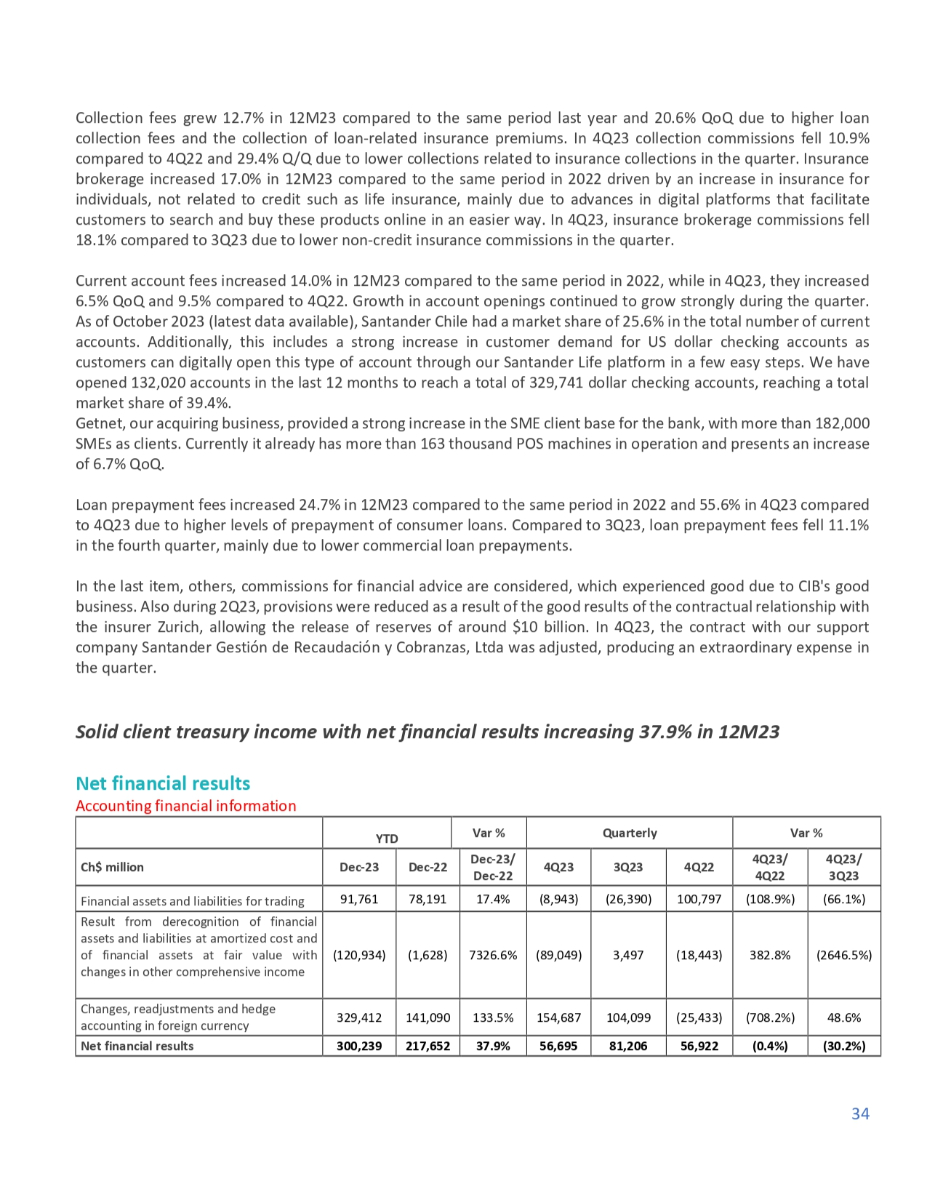 34 Collection fees grew 12 . 7 % in 12 M 23 compared to the same period last year and 20 . 6 % QoQ due to higher loan collection fees and the collection of loan - related insurance premiums . In 4 Q 23 collection commissions fell 10 . 9 % compared to 4 Q 22 and 29 . 4 % Q/Q due to lower collections related to insurance collections in the quarter . Insurance brokerage increased 17 . 0 % in 12 M 23 compared to the same period in 2022 driven by an increase in insurance for individuals, not related to credit such as life insurance, mainly due to advances in digital platforms that facilitate customers to search and buy these products online in an easier way . In 4 Q 23 , insurance brokerage commissions fell 18 . 1 % compared to 3 Q 23 due to lower non - credit insurance commissions in the quarter . Current account fees increased 14 . 0 % in 12 M 23 compared to the same period in 2022 , while in 4 Q 23 , they increased 6 . 5 % QoQ and 9 . 5 % compared to 4 Q 22 . Growth in account openings continued to grow strongly during the quarter . As of October 2023 (latest data available), Santander Chile had a market share of 25 . 6 % in the total number of current accounts . Additionally, this includes a strong increase in customer demand for US dollar checking accounts as customers can digitally open this type of account through our Santander Life platform in a few easy steps . We have opened 132 , 020 accounts in the last 12 months to reach a total of 329 , 741 dollar checking accounts, reaching a total market share of 39 . 4 % . Getnet, our acquiring business, provided a strong increase in the SME client base for the bank, with more than 182 , 000 SMEs as clients . Currently it already has more than 163 thousand POS machines in operation and presents an increase of 6 . 7 % QoQ . Loan prepayment fees increased 24 . 7 % in 12 M 23 compared to the same period in 2022 and 55 . 6 % in 4 Q 23 compared to 4 Q 23 due to higher levels of prepayment of consumer loans . Compared to 3 Q 23 , loan prepayment fees fell 11 . 1 % in the fourth quarter, mainly due to lower commercial loan prepayments . In the last item, others, commissions for financial advice are considered, which experienced good due to CIB's good business . Also during 2 Q 23 , provisions were reduced as a result of the good results of the contractual relationship with the insurer Zurich, allowing the release of reserves of around $ 10 billion . In 4 Q 23 , the contract with our support company Santander Gestión de Recaudación y Cobranzas, Ltda was adjusted, producing an extraordinary expense in the quarter . Solid client treasury income with net financial results increasing 37 . 9 % in 12 M 23 Net financial results Accounting financial information Var % Quarterly Var % YTD 4Q23/ 3Q23 4Q23/ 4Q22 4Q22 3Q23 4Q23 Dec - 23/ Dec - 22 Dec - 22 Dec - 23 Ch$ million (66.1%) (108.9%) 100,797 (26,390) (8,943) 17.4% 78,191 91,761 Financial assets and liabilities for trading (2646.5%) 382.8% (18,443) 3,497 (89,049) 7326.6% (1,628) (120,934) Result from derecognition of financial assets and liabilities at amortized cost and of financial assets at fair value with changes in other comprehensive income 48.6% (708.2%) (25,433) 104,099 154,687 133.5% 141,090 329,412 Changes, readjustments and hedge accounting in foreign currency (30.2%) (0.4%) 56,922 81,206 56,695 37.9% 217,652 300,239 Net financial results