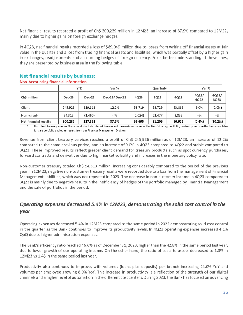 35 Net financial results recorded a profit of Ch $ 300 , 239 million in 12 M 23 , an increase of 37 . 9 % compared to 12 M 22 , mainly due to higher gains on foreign exchange hedges . In 4 Q 23 , net financial results recorded a loss of $ 89 , 049 million due to losses from writing off financial assets at fair value in the quarter and a loss from trading financial assets and liabilities, which was partially offset by a higher gain in exchanges, readjustments and accounting hedges of foreign currency . For a better understanding of these lines, they are presented by business area in the following table : Net financial results by business : Non - Accounting financial information Var % Quarterly Var % YTD 4Q23/ 3Q23 4Q23/ 4Q22 4Q22 3Q23 4Q23 Dec - 23/ Dec - 22 Dec - 22 Dec - 23 Ch$ million (0.0%) 9.0% 53,866 58,729 58,719 12.2% 219,112 245,926 Client -- % -- % 3,055 22,477 (2,024) -- % (1,460) 54,313 Non - client 1 (30.2%) (0.4%) 56,922 81,206 56,695 37.9% 217,652 300,239 Net financial results 1. Non client treasury income. These results include interest income and the mark - to - market of the Bank’s trading portfolio, realized gains from the Bank’s available for sale portfolio and other results from our Financial Management Division. Revenue from client treasury services reached a profit of Ch $ 245 , 926 million as of 12 M 23 , an increase of 12 . 2 % compared to the same previous period, and an increase of 9 . 0 % in 4 Q 23 compared to 4 Q 22 and stable compared to 3 Q 23 . These improved results reflect greater client demand for treasury products such as spot currency purchases, forward contracts and derivatives due to high market volatility and increases in the monetary policy rate . Non - customer treasury totaled Ch $ 54 , 313 million, increasing considerably compared to the period of the previous year . In 12 M 22 , negative non - customer treasury results were recorded due to a loss from the management of Financial Management liabilities, which was not repeated in 2023 . The decrease in non - customer income in 4 Q 23 compared to 3 Q 23 is mainly due to negative results in the inefficiency of hedges of the portfolio managed by Financial Management and the sale of portfolios in the period . Operating expenses decreased 5.4% in 12M23, demonstrating the solid cost control in the year Operating expenses decreased 5 . 4 % in 12 M 23 compared to the same period in 2022 demonstrating solid cost control in the quarter as the Bank continues to improve its productivity levels . In 4 Q 23 operating expenses increased 4 . 1 % QoQ due to higher administration expenses . The Bank's efficiency ratio reached 46 . 6 % as of December 31 , 2023 , higher than the 42 . 8 % in the same period last year, due to lower growth of our operating income . On the other hand, the ratio of costs to assets decreased to 1 . 3 % in 12 M 23 vs 1 . 4 $ in the same period last year . Productivity also continues to improve, with volumes (loans plus deposits) per branch increasing 24 . 0 % YoY and volumes per employee growing 8 . 9 % YoY . This increase in productivity is a reflection of the strength of our digital channels and a higher level of automation in the different cost centers . During 2023 , the Bank has focused on advancing