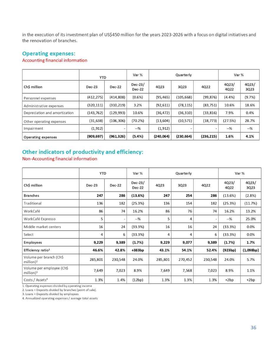 36 in the execution of its investment plan of US$450 million for the years 2023 - 2026 with a focus on digital initiatives and the renovation of branches. Operating expenses: Accounting financial information Var % Quarterly Var % YTD 4Q23/ 3Q23 4Q23/ 4Q22 4Q22 3Q23 4Q23 Dec - 23/ Dec - 22 Dec - 22 Dec - 23 Ch$ million (9.7%) (4.4%) (99,876) (105,668) (95,465) (0.6%) (414,808) (412,275) Personnel expenses 18.6% 10.6% (83,751) (78,115) (92,611) 3.2% (310,219) (320,111) Administrative expenses 0.4% 7.9% (33,816) (36,310) (36,472) 10.6% (129,993) (143,762) Depreciation and amortization 28.7% (27.5%) (18,773) (10,571) (13,604) (70.2%) (106,306) (31,638) Other operating expenses -- % -- % - - (1,912) -- % - (1,912) Impairment 4.1% 1.6% (236,215) (230,664) (240,064) (5.4%) (961,326) (909,697) Operating expenses Other indicators of productivity and efficiency: Non - Accounting financial information Var % Quarterly Var % YTD 4Q23/ 3Q23 4Q23/ 4Q22 4Q22 3Q23 4Q23 Dec - 23/ Dec - 22 Dec - 22 Dec - 23 Ch$ million (2.8%) (13.6%) 286 254 247 (13.6%) 286 247 Branches (11.7%) (25.3%) 182 154 136 (25.3%) 182 136 Traditional 13.2% 16.2% 74 76 86 16.2% 74 86 WorkCafé 25.0% -- % - 4 5 -- % - 5 WorkCafé Expresso 0.0% (33.3%) 24 16 16 (33.3%) 24 16 Middle market centers 0.0% (33.3%) 6 4 4 (33.3%) 6 4 Select 1.7% (1.7%) 9,389 9,077 9,229 (1.7%) 9,389 9,229 Employees (1,098bp) (923bp) 52.4% 54.1% 43.1% +383bp 42.8% 46.6% Efficiency ratio 1 5.7% 24.0% 230,548 270,452 285,801 24.0% 230,548 285,801 Volume per branch (Ch$ million) 2 1.1% 8.9% 7,023 7,568 7,649 8.9% 7,023 7,649 Volume per employee (Ch$ million) 3 +2bp +2bp 1.3% 1.3% 1.3% (12bp) 1.4% 1.3% Costs / Assets 4 1. Operating expenses divided by operating income 2. Loans + Deposits divided by branches (point of sale). 3. Loans + Deposits divided by employees 4. Annualized operating expenses / average total assets