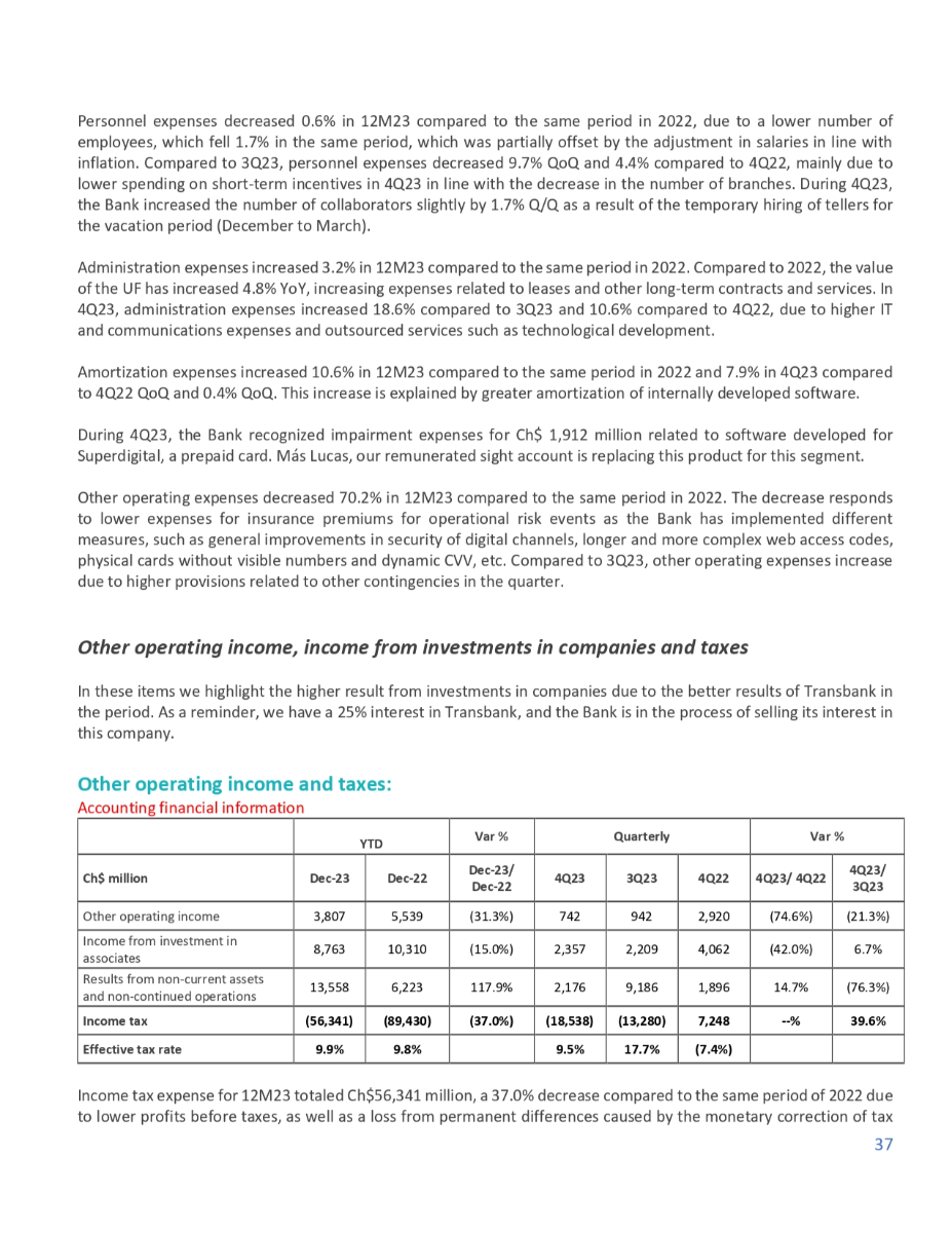 37 Personnel expenses decreased 0 . 6 % in 12 M 23 compared to the same period in 2022 , due to a lower number of employees, which fell 1 . 7 % in the same period, which was partially offset by the adjustment in salaries in line with inflation . Compared to 3 Q 23 , personnel expenses decreased 9 . 7 % QoQ and 4 . 4 % compared to 4 Q 22 , mainly due to lower spending on short - term incentives in 4 Q 23 in line with the decrease in the number of branches . During 4 Q 23 , the Bank increased the number of collaborators slightly by 1 . 7 % Q/Q as a result of the temporary hiring of tellers for the vacation period (December to March) . Administration expenses increased 3 . 2 % in 12 M 23 compared to the same period in 2022 . Compared to 2022 , the value of the UF has increased 4 . 8 % YoY, increasing expenses related to leases and other long - term contracts and services . In 4 Q 23 , administration expenses increased 18 . 6 % compared to 3 Q 23 and 10 . 6 % compared to 4 Q 22 , due to higher IT and communications expenses and outsourced services such as technological development . Amortization expenses increased 10 . 6 % in 12 M 23 compared to the same period in 2022 and 7 . 9 % in 4 Q 23 compared to 4 Q 22 QoQ and 0 . 4 % QoQ . This increase is explained by greater amortization of internally developed software . During 4 Q 23 , the Bank recognized impairment expenses for Ch $ 1 , 912 million related to software developed for Superdigital, a prepaid card . Más Lucas, our remunerated sight account is replacing this product for this segment . Other operating expenses decreased 70 . 2 % in 12 M 23 compared to the same period in 2022 . The decrease responds to lower expenses for insurance premiums for operational risk events as the Bank has implemented different measures, such as general improvements in security of digital channels, longer and more complex web access codes, physical cards without visible numbers and dynamic CVV, etc . Compared to 3 Q 23 , other operating expenses increase due to higher provisions related to other contingencies in the quarter . Other operating income, income from investments in companies and taxes In these items we highlight the higher result from investments in companies due to the better results of Transbank in the period . As a reminder, we have a 25 % interest in Transbank, and the Bank is in the process of selling its interest in this company . Other operating income and taxes : Accounting financial information Var % Quarterly Var % YTD 4Q23/ 3Q23 4Q23/ 4Q22 4Q22 3Q23 4Q23 Dec - 23/ Dec - 22 Dec - 22 Dec - 23 Ch$ million (21.3%) (74.6%) 2,920 942 742 (31.3%) 5,539 3,807 Other operating income 6.7% (42.0%) 4,062 2,209 2,357 (15.0%) 10,310 8,763 Income from investment in associates (76.3%) 14.7% 1,896 9,186 2,176 117.9% 6,223 13,558 Results from non - current assets and non - continued operations 39.6% -- % 7,248 (13,280) (18,538) (37.0%) (89,430) (56,341) Income tax (7.4%) 17.7% 9.5% 9.8% 9.9% Effective tax rate Income tax expense for 12M23 totaled Ch$56,341 million, a 37.0% decrease compared to the same period of 2022 due to lower profits before taxes, as well as a loss from permanent differences caused by the monetary correction of tax