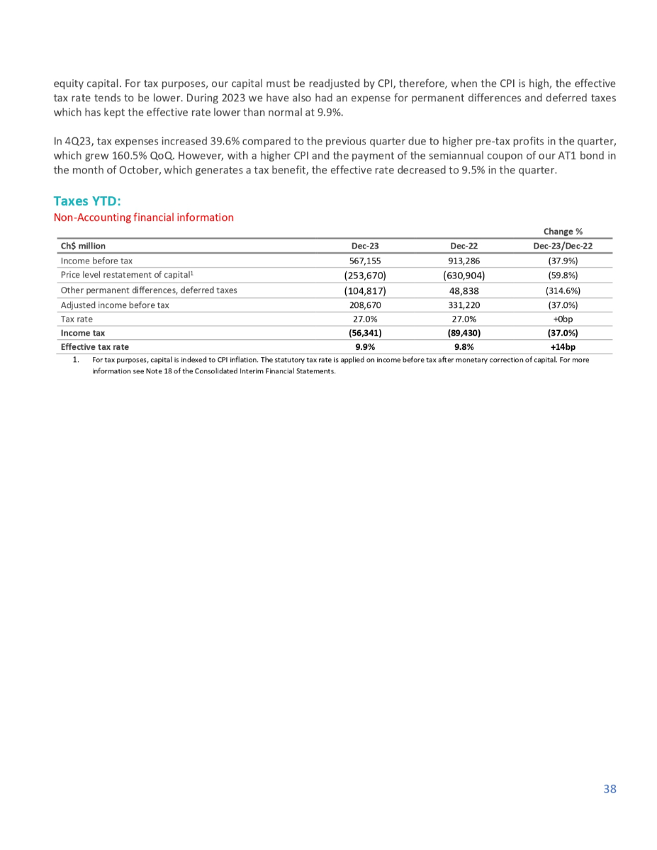 38 equity capital . For tax purposes, our capital must be readjusted by CPI, therefore, when the CPI is high, the effective tax rate tends to be lower . During 2023 we have also had an expense for permanent differences and deferred taxes which has kept the effective rate lower than normal at 9 . 9 % . In 4 Q 23 , tax expenses increased 39 . 6 % compared to the previous quarter due to higher pre - tax profits in the quarter, which grew 160 . 5 % QoQ . However, with a higher CPI and the payment of the semiannual coupon of our AT 1 bond in the month of October, which generates a tax benefit, the effective rate decreased to 9 . 5 % in the quarter . Taxes YTD : Non - Accounting financial information Change % Dec - 23/Dec - 22 Dec - 22 Dec - 23 Ch$ million (37.9%) 913,286 567,155 Income before tax (59.8%) (630,904) (253,670) Price level restatement of capital 1 (314.6%) 48,838 (104,817) Other permanent differences, deferred taxes (37.0%) 331,220 208,670 Adjusted income before tax +0bp 27.0% 27.0% Tax rate (37.0%) (89,430) (56,341) Income tax +14bp 9.8% 9.9% Effective tax rate 1. For tax purposes, capital is indexed to CPI inflation. The statutory tax rate is applied on income before tax after monetary correction of capital. For more information see Note 18 of the Consolidated Interim Financial Statements.