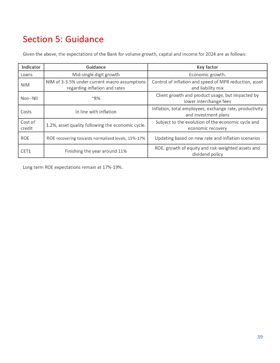 39 Section 5: Guidance Given the above, the expectations of the Bank for volume growth, capital and income for 2024 are as follows: Key factor Guidance Indicator Economic growth. Mid - single digit growth Loans Control of inflation and speed of MPR reduction, asset and liability mix NIM of 3 - 3.5% under current macro assumptions regarding inflation and rates NIM Client growth and product usage, but impacted by lower interchange fees ~8% Non - NII Inflation, total employees, exchange rate, productivity and investment plans In line with inflation Costs Subject to the evolution of the economic cycle and economic recovery 1.2%, asset quality following the economic cycle. Cost of credit Updating based on new rate and inflation scenarios ROE recovering towards normalized levels, 15% - 17% ROE ROE, growth of equity and risk - weighted assets and dividend policy Finishing the year around 11% CET1 Long term ROE expectations remain at 17% - 19%.