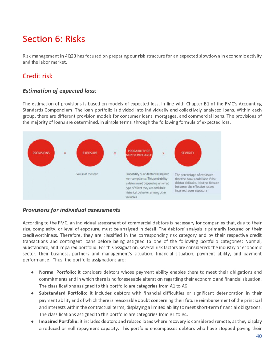 Section 6: Risks Risk management in 4 Q 23 has focused on preparing our risk structure for an expected slowdown in economic activity and the labor market . Credit risk Estimation of expected loss : The estimation of provisions is based on models of expected loss, in line with Chapter B 1 of the FMC's Accounting Standards Compendium . The loan portfolio is divided into individually and collectively analyzed loans . Within each group, there are different provision models for consumer loans, mortgages, and commercial loans . The provisions of the majority of loans are determined, in simple terms, through the following formula of expected loss . Provisions for individual assessments According to the FMC, an individual assessment of commercial debtors is necessary for companies that, due to their size, complexity, or level of exposure, must be analysed in detail . The debtors' analysis is primarily focused on their creditworthiness . Therefore, they are classified in the corresponding risk category and by their respective credit transactions and contingent loans before being assigned to one of the following portfolio categories : Normal, Substandard, and Impaired portfolio . For this assignation, several risk factors are considered : the industry or economic sector, their business, partners and management's situation, financial situation, payment ability, and payment performance . Thus, the portfolio assignations are : ● Normal Portfolio : it considers debtors whose payment ability enables them to meet their obligations and commitments and in which there is no foreseeable alteration regarding their economic and financial situation . The classifications assigned to this portfolio are categories from A 1 to A 6 . ● Substandard Portfolio : it includes debtors with financial difficulties or significant deterioration in their payment ability and of which there is reasonable doubt concerning their future reimbursement of the principal and interests within the contractual terms, displaying a limited ability to meet short - term financial obligations . The classifications assigned to this portfolio are categories from B 1 to B 4 . ● Impaired Portfolio : it includes debtors and related loans where recovery is considered remote, as they display a reduced or null repayment capacity . This portfolio encompasses debtors who have stopped paying their 40