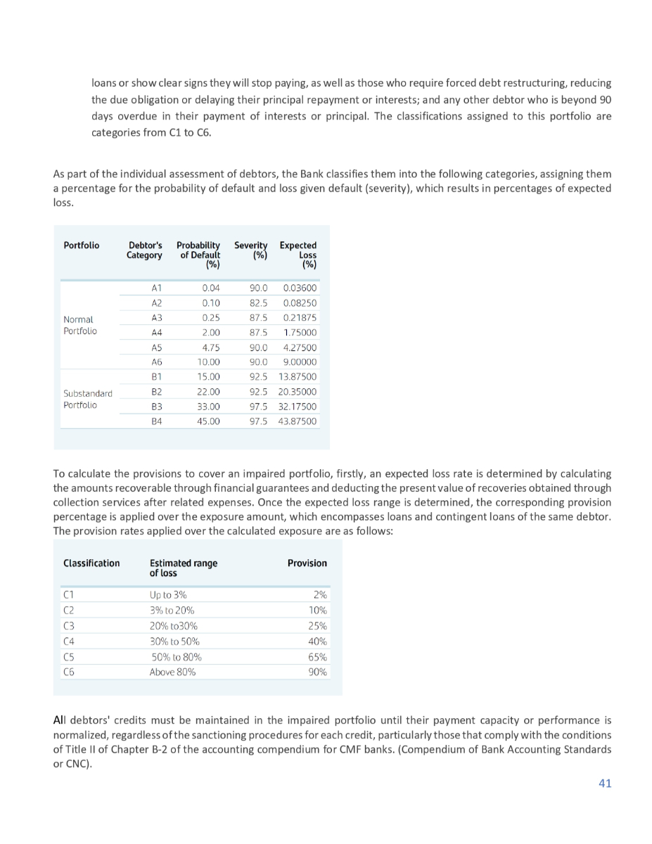 loans or show clear signs they will stop paying, as well as those who require forced debt restructuring, reducing the due obligation or delaying their principal repayment or interests ; and any other debtor who is beyond 90 days overdue in their payment of interests or principal . The classifications assigned to this portfolio are categories from C 1 to C 6 . As part of the individual assessment of debtors, the Bank classifies them into the following categories, assigning them a percentage for the probability of default and loss given default (severity), which results in percentages of expected loss . To calculate the provisions to cover an impaired portfolio, firstly, an expected loss rate is determined by calculating the amounts recoverable through financial guarantees and deducting the present value of recoveries obtained through collection services after related expenses . Once the expected loss range is determined, the corresponding provision percentage is applied over the exposure amount, which encompasses loans and contingent loans of the same debtor . The provision rates applied over the calculated exposure are as follows : Al l debtors' credits must be maintained in the impaired portfolio until their payment capacity or performance is normalized, regardless of the sanctioning procedures for each credit, particularly those that comply with the conditions of Title II of Chapter B - 2 of the accounting compendium for CMF banks . (Compendium of Bank Accounting Standards or CNC) . 41