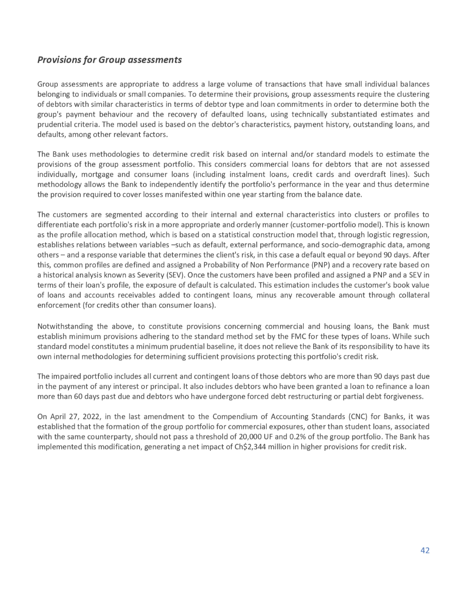 42 Provisions for Group assessments Group assessments are appropriate to address a large volume of transactions that have small individual balances belonging to individuals or small companies . To determine their provisions, group assessments require the clustering of debtors with similar characteristics in terms of debtor type and loan commitments in order to determine both the group's payment behaviour and the recovery of defaulted loans, using technically substantiated estimates and prudential criteria . The model used is based on the debtor's characteristics, payment history, outstanding loans, and defaults, among other relevant factors . The Bank uses methodologies to determine credit risk based on internal and/or standard models to estimate the provisions of the group assessment portfolio . This considers commercial loans for debtors that are not assessed individually, mortgage and consumer loans (including instalment loans, credit cards and overdraft lines) . Such methodology allows the Bank to independently identify the portfolio's performance in the year and thus determine the provision required to cover losses manifested within one year starting from the balance date . The customers are segmented according to their internal and external characteristics into clusters or profiles to differentiate each portfolio's risk in a more appropriate and orderly manner (customer - portfolio model) . This is known as the profile allocation method, which is based on a statistical construction model that, through logistic regression, establishes relations between variables – such as default, external performance, and socio - demographic data, among others – and a response variable that determines the client's risk, in this case a default equal or beyond 90 days . After this, common profiles are defined and assigned a Probability of Non Performance (PNP) and a recovery rate based on a historical analysis known as Severity (SEV) . Once the customers have been profiled and assigned a PNP and a SEV in terms of their loan's profile, the exposure of default is calculated . This estimation includes the customer's book value of loans and accounts receivables added to contingent loans, minus any recoverable amount through collateral enforcement (for credits other than consumer loans) . Notwithstanding the above, to constitute provisions concerning commercial and housing loans, the Bank must establish minimum provisions adhering to the standard method set by the FMC for these types of loans . While such standard model constitutes a minimum prudential baseline, it does not relieve the Bank of its responsibility to have its own internal methodologies for determining sufficient provisions protecting this portfolio's credit risk . The impaired portfolio includes all current and contingent loans of those debtors who are more than 90 days past due in the payment of any interest or principal . It also includes debtors who have been granted a loan to refinance a loan more than 60 days past due and debtors who have undergone forced debt restructuring or partial debt forgiveness . On April 27 , 2022 , in the last amendment to the Compendium of Accounting Standards (CNC) for Banks, it was established that the formation of the group portfolio for commercial exposures, other than student loans, associated with the same counterparty, should not pass a threshold of 20 , 000 UF and 0 . 2 % of the group portfolio . The Bank has implemented this modification, generating a net impact of Ch $ 2 , 344 million in higher provisions for credit risk .
