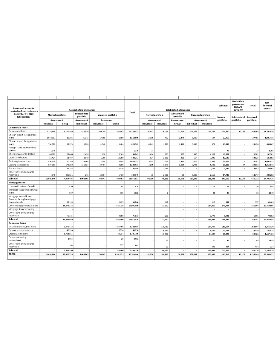 Net financial assets Total Deductible guarantees FOGAPE Covid - 19 Subtotal Established allowances Total Assets before allowances Loans and accounts receivable from customers December 31, 2023 (Ch$ million) Impaired portfolio Substandard portfolio Normal portfolio Impaired portfolio Substandard portfolio Normal portfolio Impaired portfolio Substandard portfolio Normal portfolio Assessment Assessment Assessment Assessment Assessment Assessment Individual Individual Group Individual Individual Group Individual Individual Group Individual Commercial loans 12,701,434 535,003 10,143 524,860 179,198 221,489 22,228 54,048 47,897 13,236,437 388,645 630,709 815,900 4,147,369 7,253,814 Commercial loans 1,085,431 27,465 - 27,465 694 9,329 2,444 402 14,596 1,112,896 1,090 17,098 36,345 10,206 1,048,157 Chilean export foreign trade loans 805,067 23,436 - 23,436 974 5,446 1,499 1,276 14,241 828,503 1,484 11,748 9,926 48,973 756,372 Chilean import foreign trade loans 1,201 77 - 77 - - - - 77 1,278 - - - - 1,278 Foreign trade between third parties 132,781 10,962 - 10,962 6,107 1,493 957 981 1,424 143,743 8,109 2,630 12,436 33,646 86,922 Checking accounts debtors 125,592 12,625 - 12,625 7,939 664 322 2,866 834 138,217 10,260 1,396 2,640 92,497 31,424 Credi card debtors 1,001,472 19,101 - 19,101 5,898 1,676 1,496 738 9,293 1,020,573 5,898 2,998 14,968 40,109 956,600 Factoring transactions 1,215,843 23,134 27 23,107 5,482 7,706 1,684 3,940 4,295 1,238,977 9,208 59,404 116,374 176,260 877,731 Leasing transactions 43,402 3,682 - 3,682 2,483 - - 1,199 - 47,084 10,329 - - 36,755 - Student loans 289,202 14,747 - 14,747 2,556 9,389 28 2,701 73 303,949 5,430 12,064 276 281,631 4,548 Other loans and accounts receivable 17,401,425 670,232 10,170 660,062 211,331 257,192 30,658 68,151 92,730 18,071,657 440,453 738,047 1,008,865 4,867,446 11,016,846 Subtotal Mortgage loans 458 16 - 16 15 - - 1 - 474 54 - - 420 - Loans with letters of credit 1,049 33 - 33 31 - - 2 - 1,082 115 - - 967 - Mortgage transferable mutual loans 90,403 357 - 357 210 - - 147 - 90,760 2,625 - - 88,135 - Mortgage mutual loans financed through mortgage finance bonds 16,759,996 145,994 - 145,994 114,002 - - 31,992 - 16,905,990 627,718 - - 16,278,272 - Other mortgage mutual loans - - - - - - - - - - - - - - - Mortgage financial leasing 73,152 1,981 - 1,981 1,773 - - 208 - 75,133 4,988 - - 70,145 - Other loans and accounts receivable 16,925,058 148,381 - 148,381 116,031 - - 32,350 - 17,073,439 635,500 - - 16,437,939 - Subtotal Consumer loans 3,455,320 253,564 - 253,564 134,795 - - 118,769 - 3,708,884 233,466 - - 3,475,418 - Installment consumer loans 137,925 13,029 - 13,029 6,435 - - 6,594 - 150,954 8,734 - - 142,220 - Current account debtors 1,667,463 68,326 - 68,326 24,389 - - 43,937 - 1,735,789 33,234 - - 1,702,555 - Credit card debtors 2,039 43 - 43 20 - - 23 - 2,082 29 - - 2,053 - Consumer leasing transactions 227 414 - 414 392 - - 22 - 641 537 - - 104 - Other loans and accounts receivable 5,262,974 335,376 - 335,376 166,031 - - 169,345 - 5,598,350 276,000 - - 5,322,350 - Subtotal 39,589,457 1,153,989 10,170 1,143,819 493,393 257,192 30,658 269,846 92,730 40,743,446 1,351,953 738,047 1,008,865 26,627,735 11,016,846 TOTAL