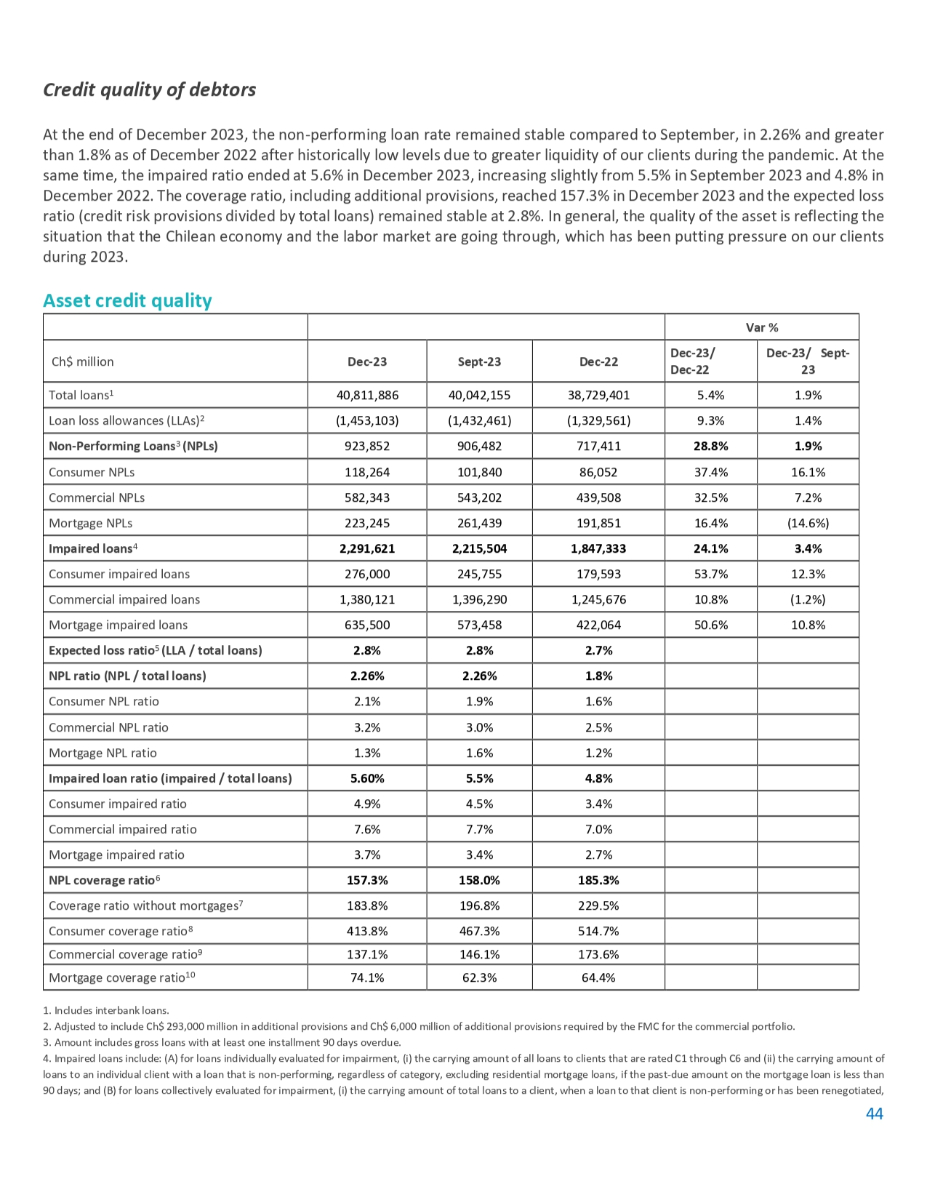 44 Credit quality of debtors At the end of December 2023 , the non - performing loan rate remained stable compared to September, in 2 . 26 % and greater than 1 . 8 % as of December 2022 after historically low levels due to greater liquidity of our clients during the pandemic . At the same time, the impaired ratio ended at 5 . 6 % in December 2023 , increasing slightly from 5 . 5 % in September 2023 and 4 . 8 % in December 2022 . The coverage ratio, including additional provisions, reached 157 . 3 % in December 2023 and the expected loss ratio (credit risk provisions divided by total loans) remained stable at 2 . 8 % . In general, the quality of the asset is reflecting the situation that the Chilean economy and the labor market are going through, which has been putting pressure on our clients during 2023 . Asset credit quality Var % Dec - 23/ Sept - 23 Dec - 23/ Dec - 22 Dec - 22 Sept - 23 Dec - 23 Ch$ million 1.9% 5.4% 38,729,401 40,042,155 40,811,886 Total loans 1 1.4% 9.3% (1,329,561) (1,432,461) (1,453,103) Loan loss allowances (LLAs) 2 1.9% 28.8% 717,411 906,482 923,852 Non - Performing Loans 3 (NPLs) 16.1% 37.4% 86,052 101,840 118,264 Consumer NPLs 7.2% 32.5% 439,508 543,202 582,343 Commercial NPLs (14.6%) 16.4% 191,851 261,439 223,245 Mortgage NPLs 3.4% 24.1% 1,847,333 2,215,504 2,291,621 Impaired loans 4 12.3% 53.7% 179,593 245,755 276,000 Consumer impaired loans (1.2%) 10.8% 1,245,676 1,396,290 1,380,121 Commercial impaired loans 10.8% 50.6% 422,064 573,458 635,500 Mortgage impaired loans 2.7% 2.8% 2.8% Expected loss ratio 5 (LLA / total loans) 1.8% 2.26% 2.26% NPL ratio (NPL / total loans) 1.6% 1.9% 2.1% Consumer NPL ratio 2.5% 3.0% 3.2% Commercial NPL ratio 1.2% 1.6% 1.3% Mortgage NPL ratio 4.8% 5.5% 5.60% Impaired loan ratio (impaired / total loans) 3.4% 4.5% 4.9% Consumer impaired ratio 7.0% 7.7% 7.6% Commercial impaired ratio 2.7% 3.4% 3.7% Mortgage impaired ratio 185.3% 158.0% 157.3% NPL coverage ratio 6 229.5% 196.8% 183.8% Coverage ratio without mortgages 7 514.7% 467.3% 413.8% Consumer coverage ratio 8 173.6% 146.1% 137.1% Commercial coverage ratio 9 64.4% 62.3% 74.1% Mortgage coverage ratio 10 1. Includes interbank loans. 2. Adjusted to include Ch$ 293,000 million in additional provisions and Ch$ 6,000 million of additional provisions required by the FMC for the commercial portfolio. 3. Amount includes gross loans with at least one installment 90 days overdue. 4. Impaired loans include : (A) for loans individually evaluated for impairment, (i) the carrying amount of all loans to clients that are rated C 1 through C 6 and (ii) the carrying amount of loans to an individual client with a loan that is non - performing, regardless of category, excluding residential mortgage loans, if the past - due amount on the mortgage loan is less than 90 days ; and (B) for loans collectively evaluated for impairment, (i) the carrying amount of total loans to a client, when a loan to that client is non - performing or has been renegotiated,