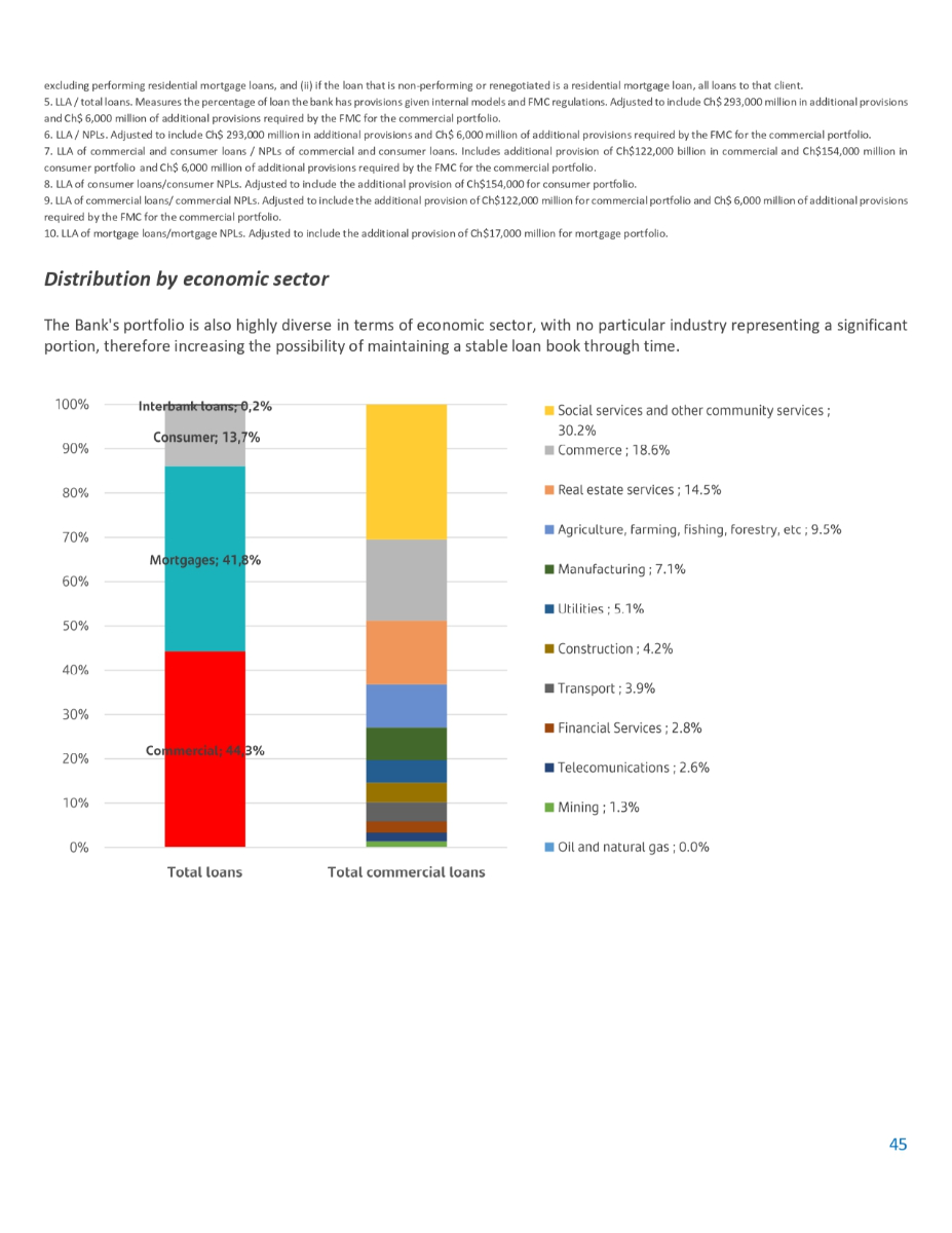 excluding performing residential mortgage loans, and (ii) if the loan that is non - performing or renegotiated is a residential mortgage loan, all loans to that client. 5. LLA / total loans. Measures the percentage of loan the bank has provisions given internal models and FMC regulations. Adjusted to include Ch$ 293,000 million in additional provisions and Ch$ 6,000 million of additional provisions required by the FMC for the commercial portfolio. 6. LLA / NPLs. Adjusted to include Ch$ 293,000 million in additional provisions and Ch$ 6,000 million of additional provisions required by the FMC for the commercial portfolio. 7. LLA of commercial and consumer loans / NPLs of commercial and consumer loans. Includes additional provision of Ch$122,000 billion in commercial and Ch$154,000 million in consumer portfolio and Ch$ 6,000 million of additional provisions required by the FMC for the commercial portfolio. 8. LLA of consumer loans/consumer NPLs. Adjusted to include the additional provision of Ch$154,000 for consumer portfolio. 9. LLA of commercial loans/ commercial NPLs. Adjusted to include the additional provision of Ch$122,000 million for commercial portfolio and Ch$ 6,000 million of additional provisions required by the FMC for the commercial portfolio. 10. LLA of mortgage loans/mortgage NPLs. Adjusted to include the additional provision of Ch$17,000 million for mortgage portfolio. 45 Distribution by economic sector The Bank's portfolio is also highly diverse in terms of economic sector, with no particular industry representing a significant portion, therefore increasing the possibility of maintaining a stable loan book through time.