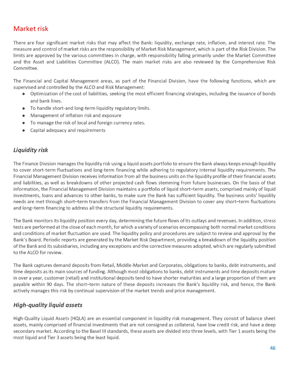 46 Market risk There are four significant market risks that may affect the Bank : liquidity, exchange rate, inflation, and interest rate . The measure and control of market risks are the responsibility of Market Risk Management, which is part of the Risk Division . The limits are approved by the various committees in charge, with responsibility falling primarily under the Market Committee and the Asset and Liabilities Committee (ALCO) . The main market risks are also reviewed by the Comprehensive Risk Committee . The Financial and Capital Management areas, as part of the Financial Division, have the following functions, which are supervised and controlled by the ALCO and Risk Management: ● Optimization of the cost of liabilities, seeking the most efficient financing strategies, including the issuance of bonds and bank lines. ● To handle short - and long - term liquidity regulatory limits. ● Management of inflation risk and exposure ● To manage the risk of local and foreign currency rates. ● Capital adequacy and requirements Liquidity risk The Finance Division manages the liquidity risk using a liquid assets portfolio to ensure the Bank always keeps enough liquidity to cover short - term fluctuations and long - term financing while adhering to regulatory internal liquidity requirements . The Financial Management Division receives information from all the business units on the liquidity profile of their financial assets and liabilities, as well as breakdowns of other projected cash flows stemming from future businesses . On the basis of that information, the Financial Management Division maintains a portfolio of liquid short – term assets, comprised mainly of liquid investments, loans and advances to other banks, to make sure the Bank has sufficient liquidity . The business units’ liquidity needs are met through short – term transfers from the Financial Management Division to cover any short – term fluctuations and long – term financing to address all the structural liquidity requirements . The Bank monitors its liquidity position every day, determining the future flows of its outlays and revenues . In addition, stress tests are performed at the close of each month, for which a variety of scenarios encompassing both normal market conditions and conditions of market fluctuation are used . The liquidity policy and procedures are subject to review and approval by the Bank’s Board . Periodic reports are generated by the Market Risk Department, providing a breakdown of the liquidity position of the Bank and its subsidiaries, including any exceptions and the corrective measures adopted, which are regularly submitted to the ALCO for review . The Bank captures demand deposits from Retail, Middle - Market and Corporates, obligations to banks, debt instruments, and time deposits as its main sources of funding . Although most obligations to banks, debt instruments and time deposits mature in over a year, customer (retail) and institutional deposits tend to have shorter maturities and a large proportion of them are payable within 90 days . The short – term nature of these deposits increases the Bank’s liquidity risk, and hence, the Bank actively manages this risk by continual supervision of the market trends and price management . High - quality liquid assets High - Quality Liquid Assets (HQLA) are an essential component in liquidity risk management . They consist of balance sheet assets, mainly comprised of financial investments that are not consigned as collateral, have low credit risk, and have a deep secondary market . According to the Basel III standards, these assets are divided into three levels, with Tier 1 assets being the most liquid and Tier 3 assets being the least liquid .