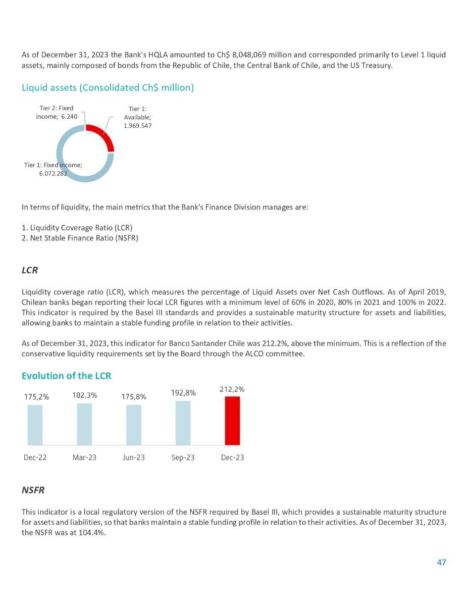 As of December 31, 2023 the Bank's HQLA amounted to Ch$ 8,048,069 million and corresponded primarily to Level 1 liquid assets, mainly composed of bonds from the Republic of Chile, the Central Bank of Chile, and the US Treasury. Liquid assets (Consolidated Ch$ million) In terms of liquidity, the main metrics that the Bank's Finance Division manages are : 1. Liquidity Coverage Ratio (LCR) 2. Net Stable Finance Ratio (NSFR) LCR Liquidity coverage ratio (LCR), which measures the percentage of Liquid Assets over Net Cash Outflows . As of April 2019 , Chilean banks began reporting their local LCR figures with a minimum level of 60 % in 2020 , 80 % in 2021 and 100 % in 2022 . This indicator is required by the Basel III standards and provides a sustainable maturity structure for assets and liabilities, allowing banks to maintain a stable funding profile in relation to their activities . As of December 31 , 2023 , this indicator for Banco Santander Chile was 212 . 2 % , above the minimum . This is a reflection of the conservative liquidity requirements set by the Board through the ALCO committee . Evolution of the LCR NSFR This indicator is a local regulatory version of the NSFR required by Basel III, which provides a sustainable maturity structure for assets and liabilities, so that banks maintain a stable funding profile in relation to their activities . As of December 31 , 2023 , the NSFR was at 104 . 4 % . Tier 1: Available; 1.969.547 Tier 1: Fixed income; 6.072.282 Tier 2: Fixed income; 6.240 47
