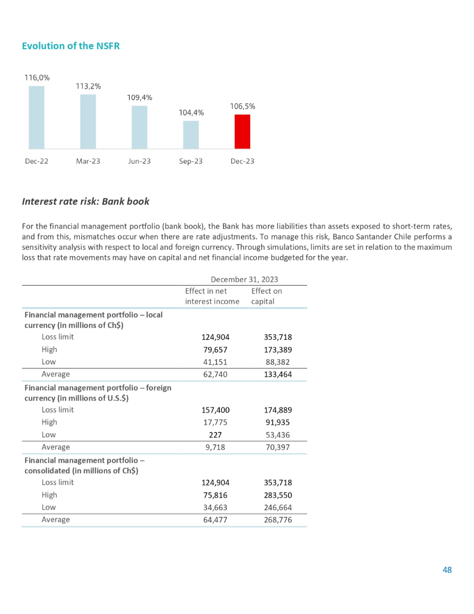 Evolution of the NSFR Interest rate risk : Bank book For the financial management portfolio (bank book), the Bank has more liabilities than assets exposed to short - term rates, and from this, mismatches occur when there are rate adjustments . To manage this risk, Banco Santander Chile performs a sensitivity analysis with respect to local and foreign currency . Through simulations, limits are set in relation to the maximum loss that rate movements may have on capital and net financial income budgeted for the year . December 31, 2023 Effect on capital Effect in net interest income Financial management portfolio – local currency (in millions of Ch$) 353,718 124,904 Loss limit 173,389 79,657 High 88,382 41,151 Low 133,464 62,740 Average Financial management portfolio – foreign currency (in millions of U.S.$) 174,889 157,400 Loss limit 91,935 17,775 High 53,436 227 Low 70,397 9,718 Average Financial management portfolio – consolidated (in millions of Ch$) 353,718 124,904 Loss limit 283,550 75,816 High 246,664 34,663 Low 268,776 64,477 Average 48