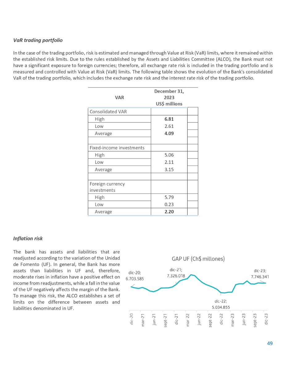 VaR trading portfolio In the case of the trading portfolio, risk is estimated and managed through Value at Risk (VaR) limits, where it remained within the established risk limits . Due to the rules established by the Assets and Liabilities Committee (ALCO), the Bank must not have a significant exposure to foreign currencies ; therefore, all exchange rate risk is included in the trading portfolio and is measured and controlled with Value at Risk (VaR) limits . The following table shows the evolution of the Bank's consolidated VaR of the trading portfolio, which includes the exchange rate risk and the interest rate risk of the trading portfolio . December 31, 2023 US$ millions VAR Consolidated VAR 6.81 High 2.61 Low 4.09 Average Fixed - income investments 5.06 High 2.11 Low 3.15 Average Foreign currency investments 5.79 High 0.23 Low 2.20 Average Inflation risk The bank has assets and liabilities that are readjusted according to the variation of the Unidad de Fomento (UF) . In general, the Bank has more assets than liabilities in UF and, therefore, moderate rises in inflation have a positive effect on income from readjustments, while a fall in the value of the UF negatively affects the margin of the Bank . To manage this risk, the ALCO establishes a set of limits on the difference between assets and liabilities denominated in UF . 49
