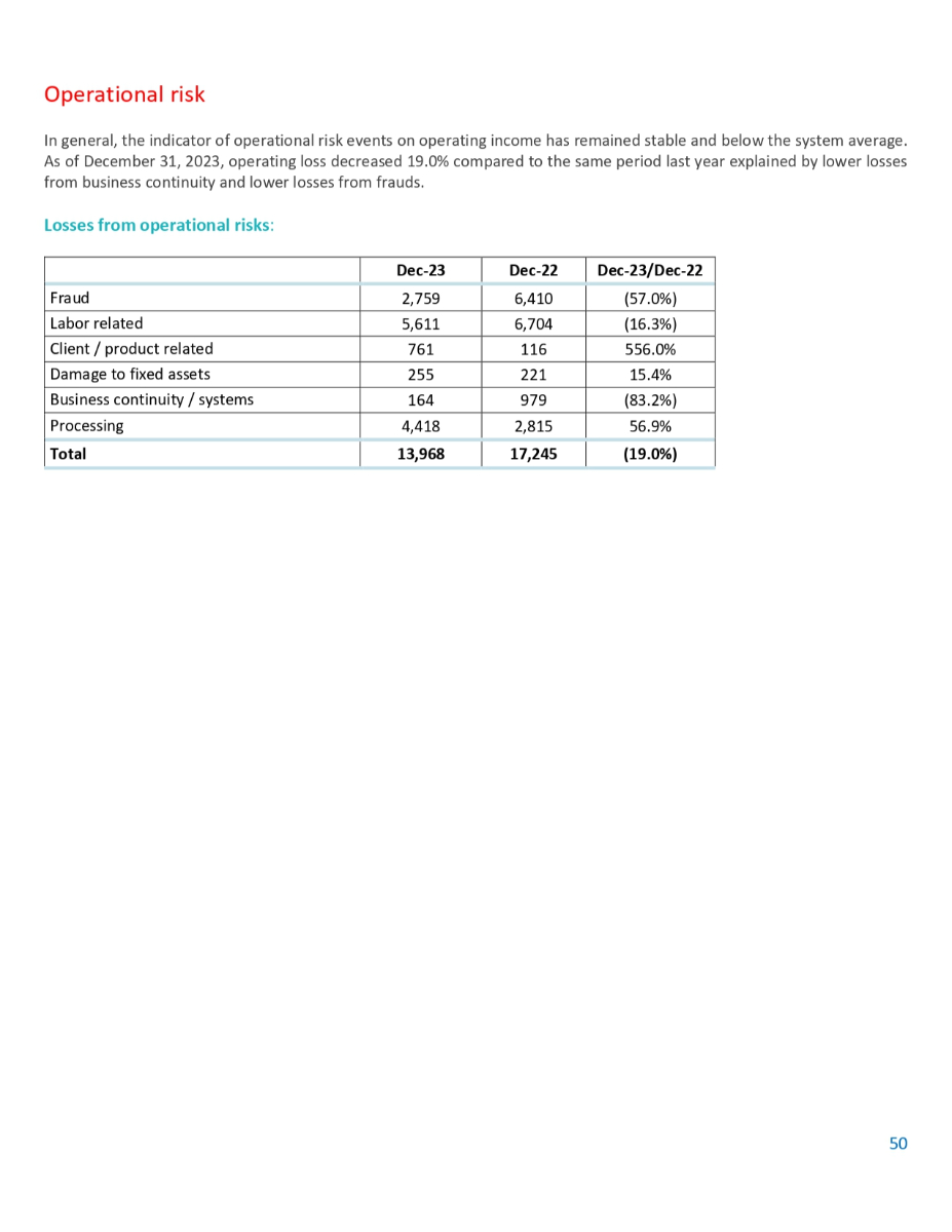 50 Operational risk In general, the indicator of operational risk events on operating income has remained stable and below the system average . As of December 31 , 2023 , operating loss decreased 19 . 0 % compared to the same period last year explained by lower losses from business continuity and lower losses from frauds . Losses from operational risks : Dec - 23/Dec - 22 Dec - 22 Dec - 23 (57.0%) 6,410 2,759 Fraud (16.3%) 6,704 5,611 Labor related 556.0% 116 761 Client / product related 15.4% 221 255 Damage to fixed assets (83.2%) 979 164 Business continuity / systems 56.9% 2,815 4,418 Processing (19.0%) 17,245 13,968 Total