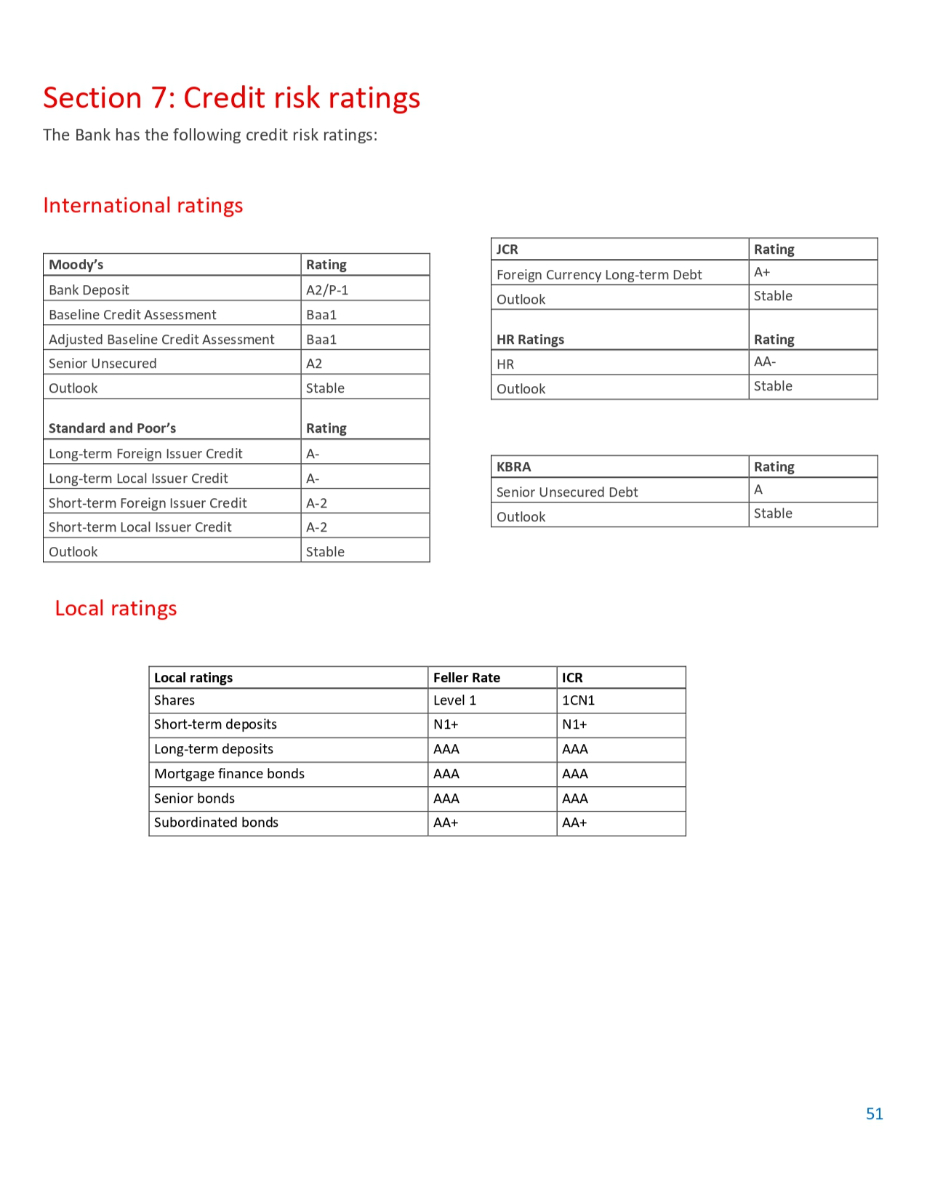 51 Section 7: Credit risk ratings The Bank has the following credit risk ratings: International ratings Rating Moody’s A2/P - 1 Bank Deposit Baa1 Baseline Credit Assessment Baa1 Adjusted Baseline Credit Assessment A2 Senior Unsecured Stable Outlook Rating Standard and Poor’s A - Long - term Foreign Issuer Credit A - Long - term Local Issuer Credit A - 2 Short - term Foreign Issuer Credit A - 2 Short - term Local Issuer Credit Stable Outlook Rating JCR A+ Foreign Currency Long - term Debt Stable Outlook Rating HR Ratings AA - HR Stable Outlook Rating KBRA A Senior Unsecured Debt Stable Outlook Local ratings ICR Feller Rate Local ratings 1CN1 Level 1 Shares N1+ N1+ Short - term deposits AAA AAA Long - term deposits AAA AAA Mortgage finance bonds AAA AAA Senior bonds AA+ AA+ Subordinated bonds