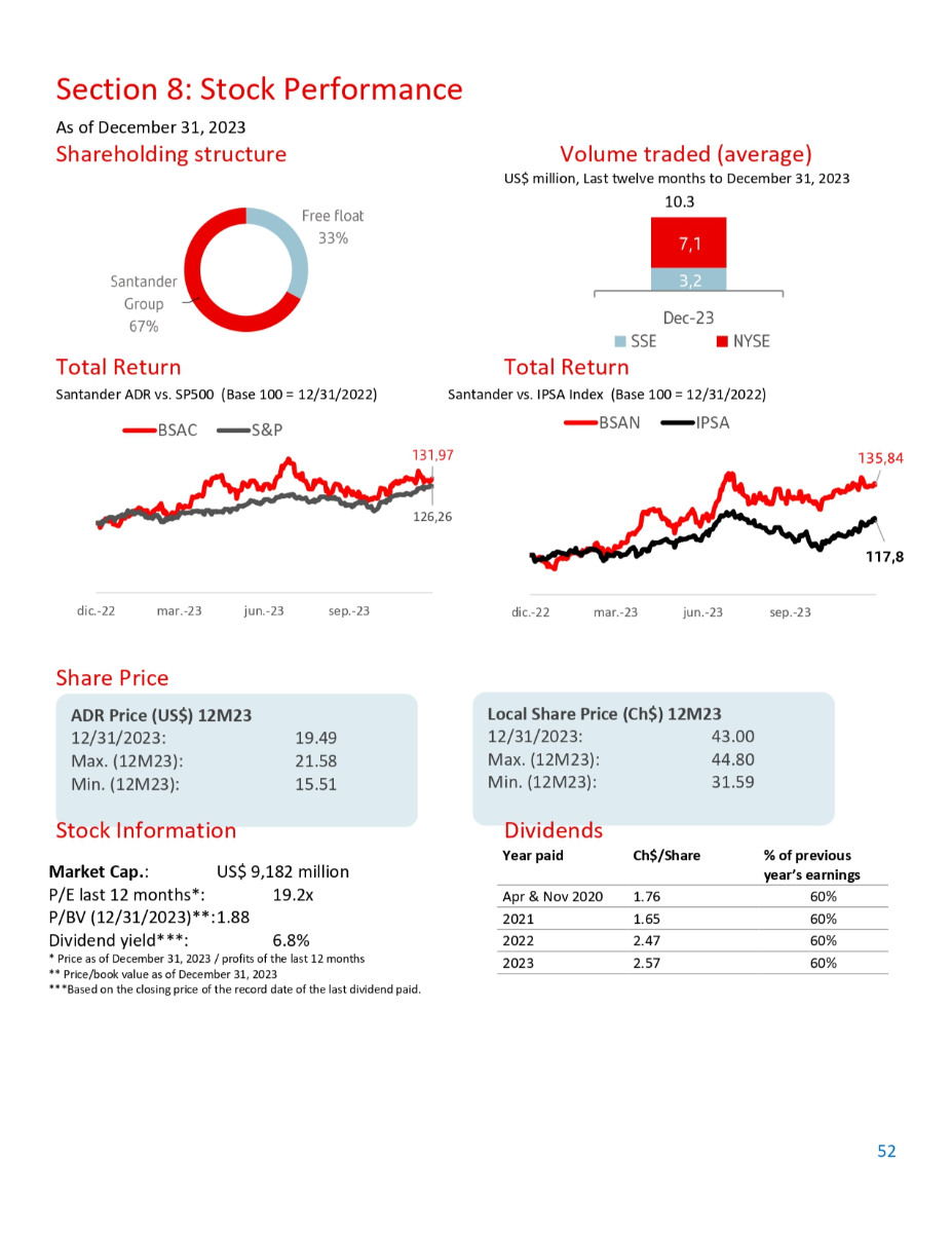 19.49 21.58 15.51 Share Price ADR Price (US$) 12M23 12/31/2023: Max. (12M23): Min. (12M23): Local Share Price (Ch$) 12M23 12/31/2023: Max. (12M23): Min. (12M23): 43.00 44.80 31.59 Market Cap. : P/E last 12 months*: US$ 9,182 million 19.2x P/BV (12/31/2023)**:1.88 Dividend yield***: 6.8% * Price as of December 31, 2023 / profits of the last 12 months ** Price/book value as of December 31, 2023 ***Based on the closing price of the record date of the last dividend paid. Section 8: Stock Performance As of December 31, 2023 Shareholding structure Volume traded (average) US$ million, Last twelve months to December 31, 2023 10.3 Stock Information Dividends % of previous year’s earnings Ch$/Share Year paid 60% 1.76 Apr & Nov 2020 60% 1.65 2021 60% 2.47 2022 60% 2.57 2023 126,26 dic. - 22 mar. - 23 jun. - 23 sep. - 23 Total Return Santander ADR vs. SP500 (Base 100 = 12/31/2022) BSAC S&P dic. - 22 mar. - 23 jun. - 23 sep. - 23 Total Return Santander vs. IPSA Index (Base 100 = 12/31/2022) BSAN IPSA 52