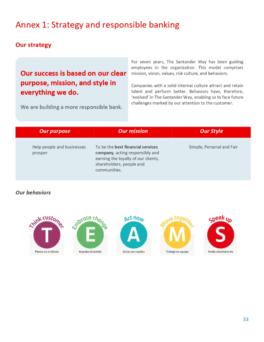 Our success is based on a clear We are building a more responsible bank. Our success is based on our clear purpose, mis s i o n , a a n n d d s s t t y y l e l e f i o n r doing things. everything we do. We are building a more responsible bank. Annex 1: Strategy and responsible banking Our strategy Our Style Our mission Our purpose Simple, Personal and Fair To be the best financial services company , acting responsibly and earning the loyalty of our clients, shareholders, people and communities. Help people and businesses prosper Our behaviors For seven years, The Santander Way has been the guide for employees in the organization . This model encompasses the mission, vision, values, risk culture and behaviors . Companies with a strong internal culture attract and retain talent, as well as perform better . For this reason, the behaviors have "evolved" in The Santander Way, which allow us to face the challenges of the future, marked by customer service . For seven years, The Santander Way has been guiding employees in the organization . This model comprises mission, vision, values, risk culture, and behaviors . Companies with a solid internal culture attract and retain talent and perform better . Behaviors have, therefore, ‘evolved’ in The Santander Way, enabling us to face future challenges marked by our attention to the customer . 53