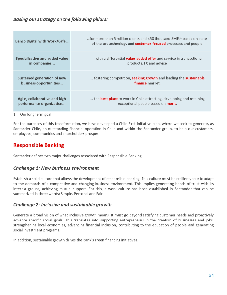 54 Basing our strategy on the following pillars: …for more than 5 million clients and 450 thousand SMEs 1 based on state - of - the - art technology and customer - focused processes and people. Banco Digital with Work/Café… …with a differential value - added offer and service in transactional products, FX and advice. Specialization and added value in companies... … fostering competition, seeking growth and leading the sustainable finance market. Sustained generation of new business opportunities... … the best place to work in Chile attracting, developing and retaining exceptional people based on merit . Agile, collaborative and high performance organization... 1. Our long term goal For the purposes of this transformation, we have developed a Chile First initiative plan, where we seek to generate, as Santander Chile, an outstanding financial operation in Chile and within the Santander group, to help our customers, employees, communities and shareholders prosper . Responsible Banking Santander defines two major challenges associated with Responsible Banking : Challenge 1: New business environment Establish a solid culture that allows the development of responsible banking . This culture must be resilient, able to adapt to the demands of a competitive and changing business environment . This implies generating bonds of trust with its interest groups, achieving mutual support . For this, a work culture has been established in Santander that can be summarized in three words : Simple, Personal and Fair . Challenge 2: Inclusive and sustainable growth Generate a broad vision of what inclusive growth means . It must go beyond satisfying customer needs and proactively advance specific social goals . This translates into supporting entrepreneurs in the creation of businesses and jobs, strengthening local economies, advancing financial inclusion, contributing to the education of people and generating social investment programs . In addition, sustainable growth drives the Bank's green financing initiatives .