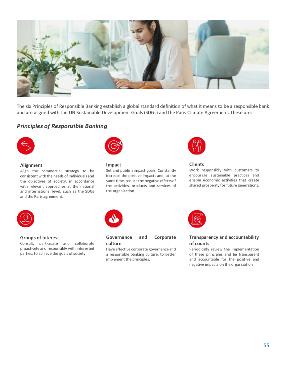 The six Principles of Responsible Banking establish a global standard definition of what it means to be a responsible bank and are aligned with the UN Sustainable Development Goals (SDGs) and the Paris Climate Agreement. These are: Principles of Responsible Banking Alignment Align the commercial strategy to be consistent with the needs of individuals and the objectives of society, in accordance with relevant approaches at the national and international level, such as the SDGs and the Paris agreement . 55 Impact Set and publish impact goals . Constantly increase the positive impacts and, at the same time, reduce the negative effects of the activities, products and services of the organization . Clients Work responsibly with customers to encourage sustainable practices and enable economic activities that create shared prosperity for future generations . Groups of interest Consult, participate and collaborate proactively and responsibly with interested parties, to achieve the goals of society . Governance and Corporate culture Have effective corporate governance and a responsible banking culture, to better implement the principles . Transparency and accountability of counts Periodically review the implementation of these principles and be transparent and accountable for the positive and negative impacts on the organization .