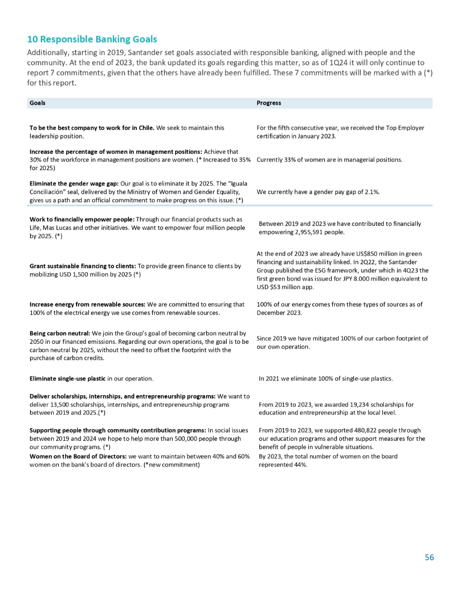 56 10 Responsible Banking Goals Additionally, starting in 2019, Santander set goals associated with responsible banking, aligned with people and the community. At the end of 2023, the bank updated its goals regarding this matter, so as of 1Q24 it will only continue to report 7 commitments, given that the others have already been fulfilled. These 7 commitments will be marked with a (*) for this report. Progress Goals For the fifth consecutive year, we received the Top Employer certification in January 2023. To be the best company to work for in Chile. We seek to maintain this leadership position. Currently 33% of women are in managerial positions. Increase the percentage of women in management positions: Achieve that 30% of the workforce in management positions are women. (* Increased to 35% for 2025) We currently have a gender pay gap of 2.1%. Eliminate the gender wage gap: Our goal is to eliminate it by 2025. The “Iguala Conciliación” seal, delivered by the Ministry of Women and Gender Equality, gives us a path and an official commitment to make progress on this issue. (*) Between 2019 and 2023 we have contributed to financially empowering 2,955,591 people. Work to financially empower people: Through our financial products such as Life, Mas Lucas and other initiatives. We want to empower four million people by 2025. (*) At the end of 2023 we already have US$850 million in green financing and sustainability linked. In 2Q22, the Santander Group published the ESG framework, under which in 4Q23 the first green bond was issued for JPY 8.000 million equivalent to USD $53 million app. Grant sustainable financing to clients: To provide green finance to clients by mobilizing USD 1,500 million by 2025 (*) 100% of our energy comes from these types of sources as of December 2023. Increase energy from renewable sources: We are committed to ensuring that 100% of the electrical energy we use comes from renewable sources. Since 2019 we have mitigated 100% of our carbon footprint of our own operation. Being carbon neutral: We join the Group's goal of becoming carbon neutral by 2050 in our financed emissions. Regarding our own operations, the goal is to be carbon neutral by 2025, without the need to offset the footprint with the purchase of carbon credits. In 2021 we eliminate 100% of single - use plastics. Eliminate single - use plastic in our operation. From 2019 to 2023, we awarded 19,234 scholarships for education and entrepreneurship at the local level. Deliver scholarships, internships, and entrepreneurship programs: We want to deliver 13,500 scholarships, internships, and entrepreneurship programs between 2019 and 2025.(*) From 2019 to 2023, we supported 480,822 people through our education programs and other support measures for the benefit of people in vulnerable situations. Supporting people through community contribution programs: In social issues between 2019 and 2024 we hope to help more than 500,000 people through our community programs. (*) By 2023, the total number of women on the board represented 44%. Women on the Board of Directors: we want to maintain between 40% and 60% women on the bank's board of directors. (*new commitment)
