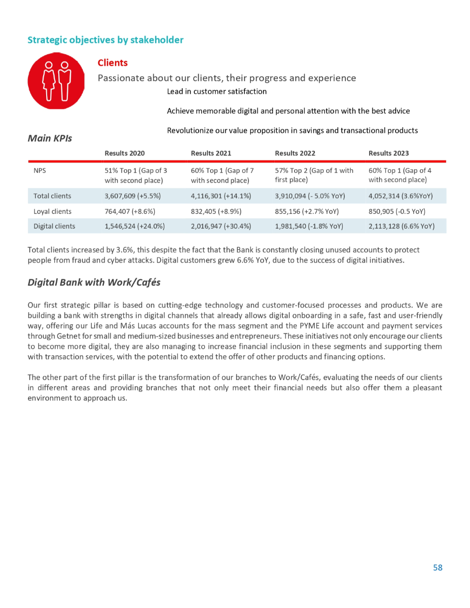 Strategic objectives by stakeholder Clients Passionate about our clients, their progress and experience Lead in customer satisfaction Achieve memorable digital and personal attention with the best advice 58 Main KPIs Results 2023 Results 2022 Results 2021 Results 2020 60% Top 1 (Gap of 4 with second place) 57% Top 2 (Gap of 1 with first place) 60% Top 1 (Gap of 7 with second place) 51% Top 1 (Gap of 3 with second place) NPS 4,052,314 (3.6%YoY) 3,910,094 ( - 5.0% YoY) 4,116,301 (+14.1%) 3,607,609 (+5.5%) Total clients 850,905 ( - 0.5 YoY) 855,156 (+2.7% YoY) 832,405 (+8.9%) 764,407 (+8.6%) Loyal clients 2,113,128 (6.6% YoY) 1,981,540 ( - 1.8% YoY) 2,016,947 (+30.4%) 1,546,524 (+24.0%) Digital clients Total clients increased by 3.6%, this despite the fact that the Bank is constantly closing unused accounts to protect people from fraud and cyber attacks. Digital customers grew 6.6% YoY, due to the success of digital initiatives. Digital Bank with Work/Cafés Our first strategic pillar is based on cutting - edge technology and customer - focused processes and products . We are building a bank with strengths in digital channels that already allows digital onboarding in a safe, fast and user - friendly way, offering our Life and Más Lucas accounts for the mass segment and the PYME Life account and payment services through Getnet for small and medium - sized businesses and entrepreneurs . These initiatives not only encourage our clients to become more digital, they are also managing to increase financial inclusion in these segments and supporting them with transaction services, with the potential to extend the offer of other products and financing options . The other part of the first pillar is the transformation of our branches to Work/Cafés, evaluating the needs of our clients in different areas and providing branches that not only meet their financial needs but also offer them a pleasant environment to approach us . Revolutionize our value proposition in savings and transactional products