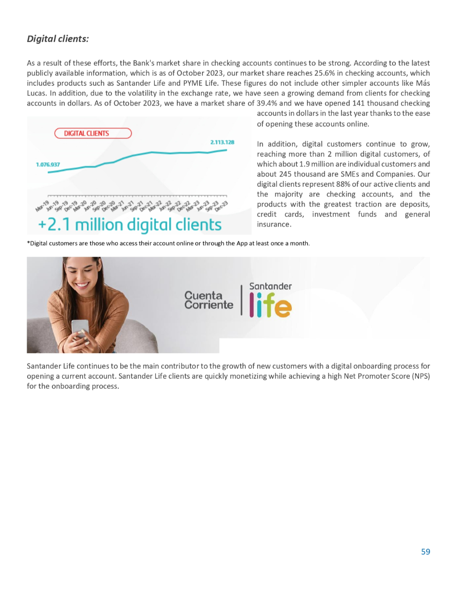 Digital clients : As a result of these efforts, the Bank's market share in checking accounts continues to be strong . According to the latest publicly available information, which is as of October 2023 , our market share reaches 25 . 6 % in checking accounts, which includes products such as Santander Life and PYME Life . These figures do not include other simpler accounts like Más Lucas . In addition, due to the volatility in the exchange rate, we have seen a growing demand from clients for checking accounts in dollars . As of October 2023 , we have a market share of 39 . 4 % and we have opened 141 thousand checking accounts in dollars in the last year thanks to the ease of opening these accounts online . In addition, digital customers continue to grow, reaching more than 2 million digital customers, of which about 1 . 9 million are individual customers and about 245 thousand are SMEs and Companies . Our digital clients represent 88 % of our active clients and the majority are checking accounts, and the products with the greatest traction are deposits, credit cards, investment funds and general insurance . *Digital customers are those who access their account online or through the App at least once a month . Santander Life continues to be the main contributor to the growth of new customers with a digital onboarding process for opening a current account . Santander Life clients are quickly monetizing while achieving a high Net Promoter Score (NPS) for the onboarding process . 59