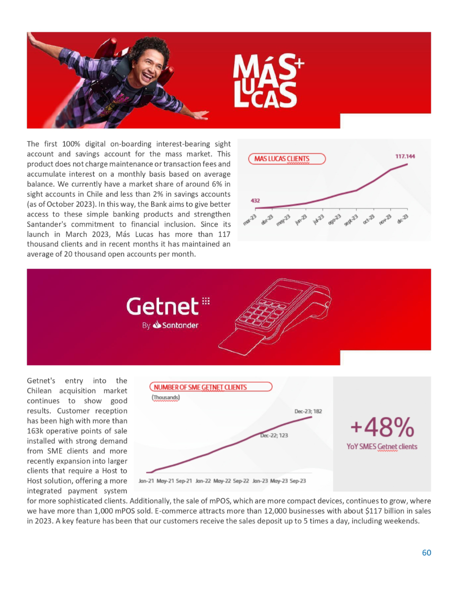 The first 100 % digital on - boarding interest - bearing sight account and savings account for the mass market . This product does not charge maintenance or transaction fees and accumulate interest on a monthly basis based on average balance . We currently have a market share of around 6 % in sight accounts in Chile and less than 2 % in savings accounts (as of October 2023 ) . In this way, the Bank aims to give better access to these simple banking products and strengthen Santander's commitment to financial inclusion . Since its launch in March 2023 , Más Lucas has more than 117 thousand clients and in recent months it has maintained an average of 20 thousand open accounts per month . Getnet's entry into the Chilean acquisition market continues to show good results . Customer reception has been high with more than 163 k operative points of sale installed with strong demand from SME clients and more recently expansion into larger clients that require a Host to Host solution, offering a more integrated payment system for more sophisticated clients . Additionally, the sale of mPOS, which are more compact devices, continues to grow, where we have more than 1 , 000 mPOS sold . E - commerce attracts more than 12 , 000 businesses with about $ 117 billion in sales in 2023 . A key feature has been that our customers receive the sales deposit up to 5 times a day, including weekends . 60