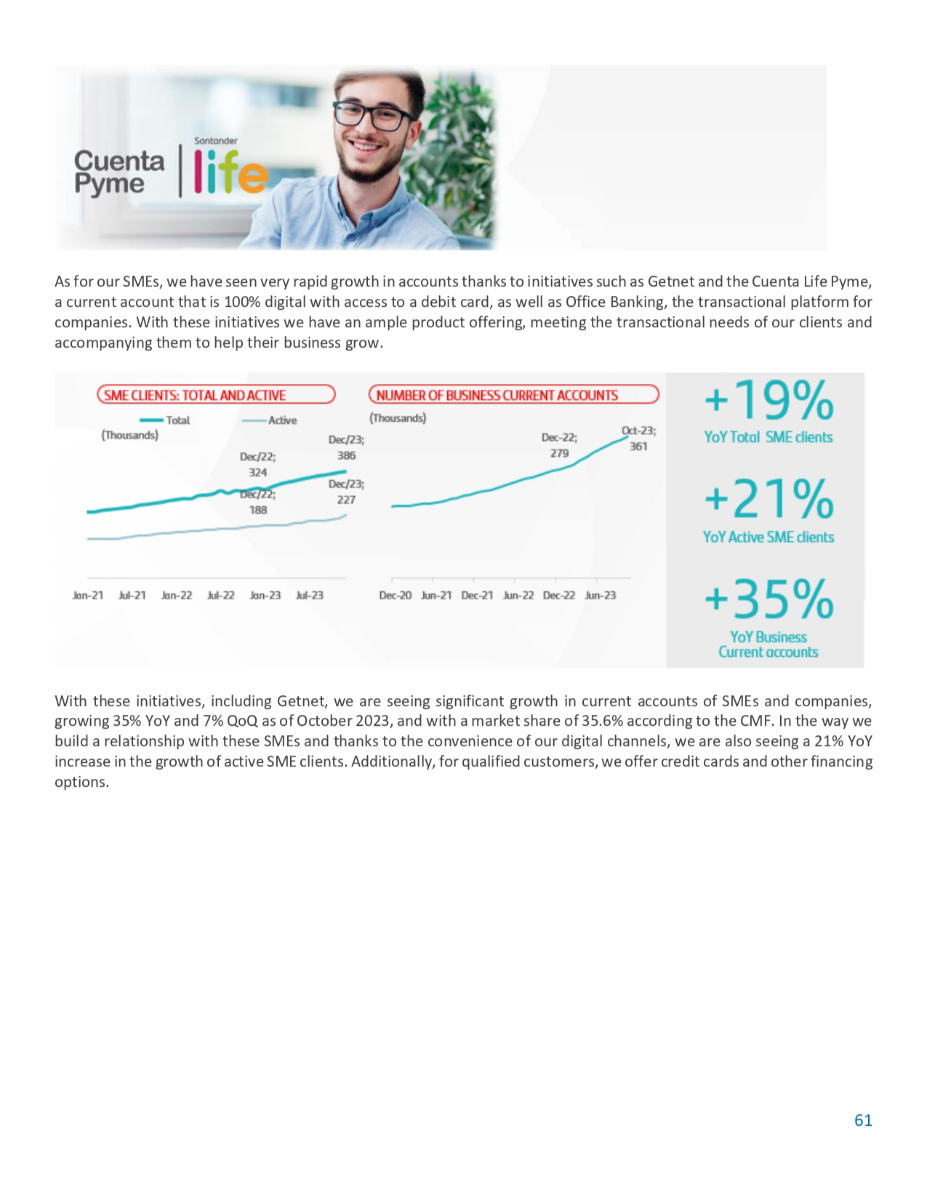 As for our SMEs, we have seen very rapid growth in accounts thanks to initiatives such as Getnet and the Cuenta Life Pyme, a current account that is 100 % digital with access to a debit card, as well as Office Banking, the transactional platform for companies . With these initiatives we have an ample product offering, meeting the transactional needs of our clients and accompanying them to help their business grow . With these initiatives, including Getnet, we are seeing significant growth in current accounts of SMEs and companies, growing 35 % YoY and 7 % QoQ as of October 2023 , and with a market share of 35 . 6 % according to the CMF . In the way we build a relationship with these SMEs and thanks to the convenience of our digital channels, we are also seeing a 21 % YoY increase in the growth of active SME clients . Additionally, for qualified customers, we offer credit cards and other financing options . 61