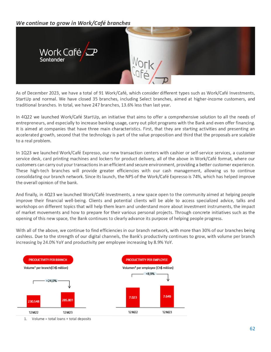 We continue to grow in Work/Café branches As of December 2023 , we have a total of 91 Work/Café, which consider different types such as Work/Café Investments, StartUp and normal . We have closed 35 branches, including Select branches, aimed at higher - income customers, and traditional branches . In total, we have 247 branches, 13 . 6 % less than last year . In 4 Q 22 we launched Work/Café StartUp, an initiative that aims to offer a comprehensive solution to all the needs of entrepreneurs, and especially to increase banking usage, carry out pilot programs with the Bank and even offer financing . It is aimed at companies that have three main characteristics . First, that they are starting activities and presenting an accelerated growth, second that the technology is part of the value proposition and third that the proposals are scalable to a real problem . In 1 Q 23 we launched Work/Café Expresso, our new transaction centers with cashier or self - service services, a customer service desk, card printing machines and lockers for product delivery, all of the above in Work/Café format, where our customers can carry out your transactions in an efficient and secure environment, providing a better customer experience . These high - tech branches will provide greater efficiencies with our cash management, allowing us to continue consolidating our branch network . Since its launch, the NPS of the Work/Café Expresso is 74 % , which has helped improve the overall opinion of the bank . And finally, in 4 Q 23 we launched Work/Café Investments, a new space open to the community aimed at helping people improve their financial well - being . Clients and potential clients will be able to access specialized advice, talks and workshops on different topics that will help them learn and understand more about investment instruments, the impact of market movements and how to prepare for their various personal projects . Through concrete initiatives such as the opening of this new space, the Bank continues to clearly advance its purpose of helping people progress . With all of the above, we continue to find efficiencies in our branch network, with more than 30 % of our branches being cashless . Due to the strength of our digital channels, the Bank's productivity continues to grow, with volume per branch increasing by 24 . 0 % YoY and productivity per employee increasing by 8 . 9 % YoY . 1. Volume = total loans + total deposits 62