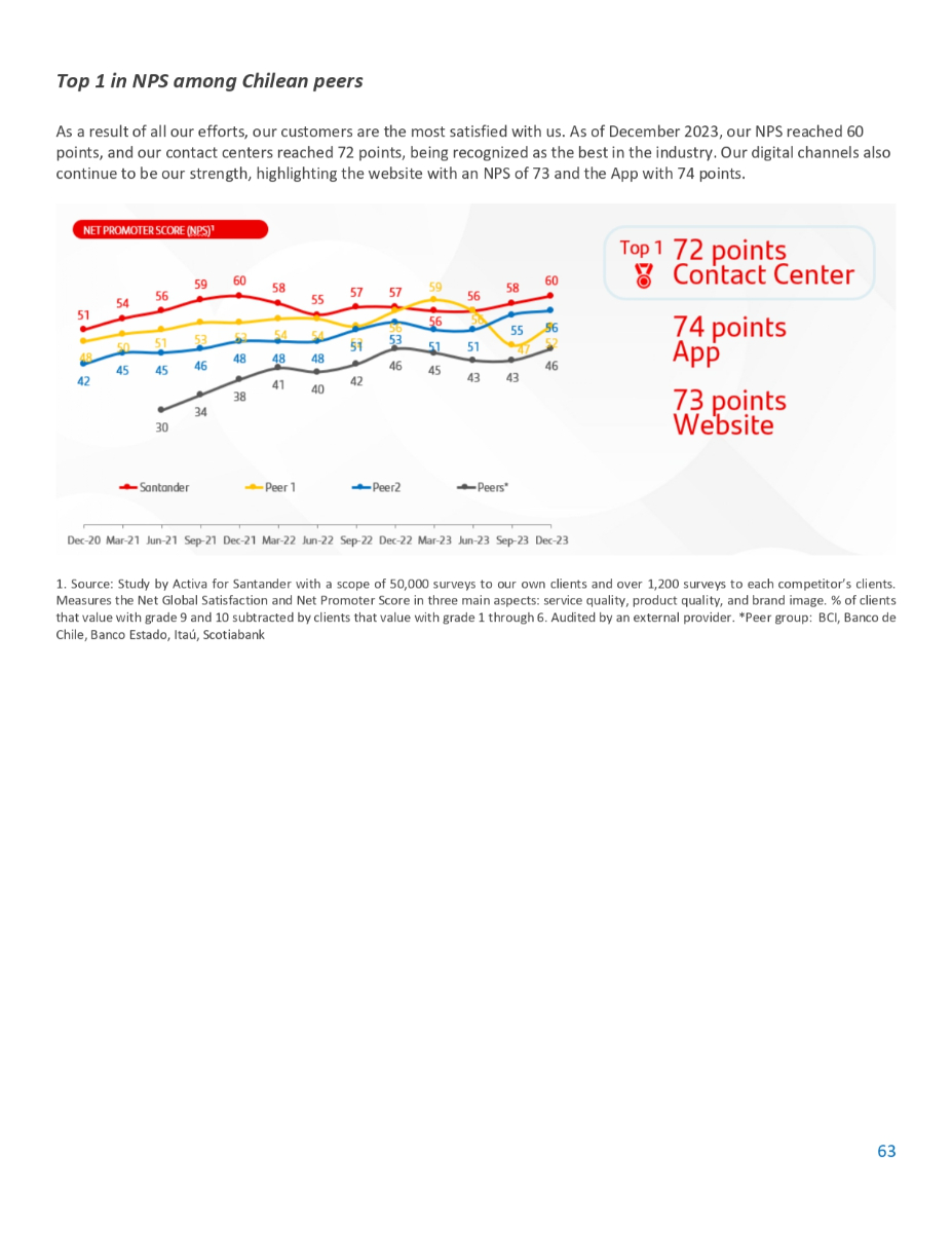 Top 1 in NPS among Chilean peers As a result of all our efforts, our customers are the most satisfied with us. As of December 2023, our NPS reached 60 points, and our contact centers reached 72 points, being recognized as the best in the industry. Our digital channels also continue to be our strength, highlighting the website with an NPS of 73 and the App with 74 points. 1 . Source : Study by Activa for Santander with a scope of 50 , 000 surveys to our own clients and over 1 , 200 surveys to each competitor’s clients . Measures the Net Global Satisfaction and Net Promoter Score in three main aspects : service quality, product quality, and brand image . % of clients that value with grade 9 and 10 subtracted by clients that value with grade 1 through 6 . Audited by an external provider . *Peer group : BCI, Banco de Chile, Banco Estado, Itaú, Scotiabank 63