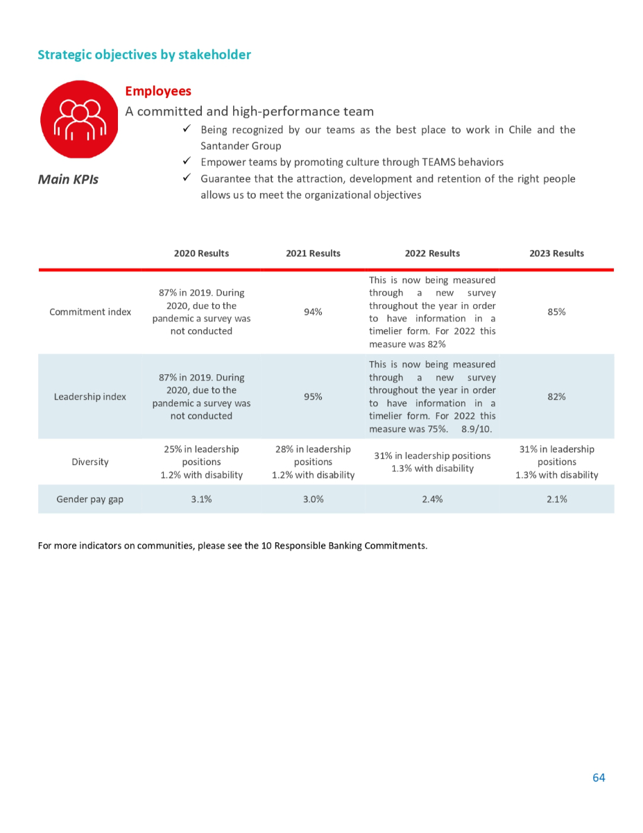 Strategic objectives by stakeholder Employees A committed and high - performance team 64 Main KPIs For more indicators on communities, please see the 10 Responsible Banking Commitments. 2023 Results 2022 Results 2021 Results 2020 Results 85% This is now being measured through a new survey throughout the year in order to have information in a timelier form . For 2022 this measure was 82 % 94% 87% in 2019. During 2020, due to the pandemic a survey was not conducted Commitment index 82% This is now being measured through a new survey throughout the year in order to have information in a timelier form . For 2022 this measure was 75 % . 8 . 9 / 10 . 95% 87% in 2019. During 2020, due to the pandemic a survey was not conducted Leadership index 31% in leadership positions 1.3% with disability 31% in leadership positions 1.3% with disability 28% in leadership positions 1.2% with disability 25% in leadership positions 1.2% with disability Diversity 2.1% 2.4% 3.0% 3.1% Gender pay gap x Being recognized by our teams as the best place to work in Chile and the Santander Group x Empower teams by promoting culture through TEAMS behaviors x Guarantee that the attraction, development and retention of the right people allows us to meet the organizational objectives