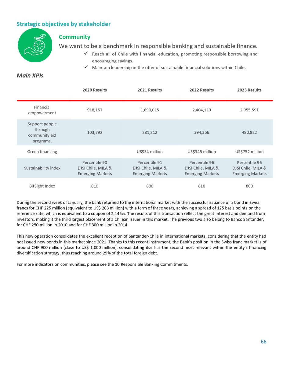 Strategic objectives by stakeholder Community We want to be a benchmark in responsible banking and sustainable finance. x Reach all of Chile with financial education, promoting responsible borrowing and encouraging savings. x Maintain leadership in the offer of sustainable financial solutions within Chile. Main KPIs 66 2023 Results 2022 Results 2021 Results 2020 Results 2,955,591 2,404,119 1,690,015 918,157 Financial empowerment 480,822 394,356 281,212 103,792 Support people through community aid programs. US$752 million US$345 million US$54 million Green financing Percentile 96 DJSI Chile, MILA & Emerging Markets Percentile 96 DJSI Chile, MILA & Emerging Markets Percentile 91 DJSI Chile, MILA & Emerging Markets Percentile 90 DJSI Chile, MILA & Emerging Markets Sustainability index 800 810 800 810 BitSight Index During the second week of January, the bank returned to the international market with the successful issuance of a bond in Swiss francs for CHF 225 million (equivalent to US$ 263 million) with a term of three years, achieving a spread of 125 basis points on the reference rate, which is equivalent to a coupon of 2.445%. The results of this transaction reflect the great interest and demand from investors, making it the third largest placement of a Chilean issuer in this market. The previous two also belong to Banco Santander, for CHF 250 million in 2010 and for CHF 300 million in 2014. This new operation consolidates the excellent reception of Santander - Chile in international markets, considering that the entity had not issued new bonds in this market since 2021 . Thanks to this recent instrument, the Bank's position in the Swiss franc market is of around CHF 900 million (close to US $ 1 , 000 million), consolidating itself as the second most relevant within the entity's financing diversification strategy, thus reaching around 25 % of the total foreign debt . For more indicators on communities, please see the 10 Responsible Banking Commitments .
