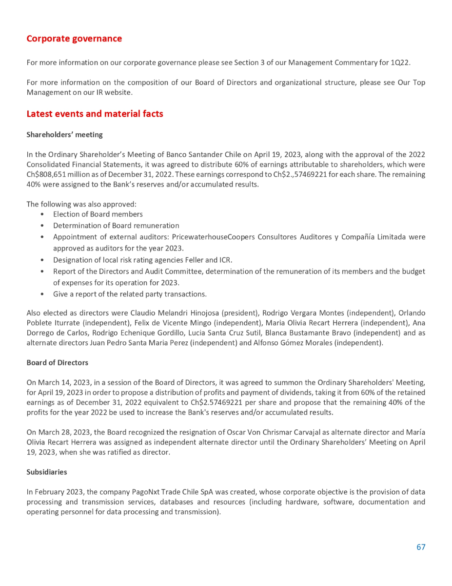 67 Corporate governance For more information on our corporate governance please see Section 3 of our Management Commentary for 1Q22. For more information on the composition of our Board of Directors and organizational structure, please see Our Top Management on our IR website . Latest events and material facts Shareholders’ meeting In the Ordinary Shareholder’s Meeting of Banco Santander Chile on April 19 , 2023 , along with the approval of the 2022 Consolidated Financial Statements, it was agreed to distribute 60 % of earnings attributable to shareholders, which were Ch $ 808 , 651 million as of December 31 , 2022 . These earnings correspond to Ch $ 2 . , 57469221 for each share . The remaining 40 % were assigned to the Bank’s reserves and/or accumulated results . The following was also approved: • Election of Board members • Determination of Board remuneration • Appointment of external auditors: PricewaterhouseCoopers Consultores Auditores y Compañía Limitada were approved as auditors for the year 2023. • Designation of local risk rating agencies Feller and ICR. • Report of the Directors and Audit Committee, determination of the remuneration of its members and the budget of expenses for its operation for 2023. • Give a report of the related party transactions. Also elected as directors were Claudio Melandri Hinojosa (president), Rodrigo Vergara Montes (independent), Orlando Poblete Iturrate (independent), Felix de Vicente Mingo (independent), Maria Olivia Recart Herrera (independent), Ana Dorrego de Carlos, Rodrigo Echenique Gordillo, Lucia Santa Cruz Sutil, Blanca Bustamante Bravo (independent) and as alternate directors Juan Pedro Santa Maria Perez (independent) and Alfonso Gómez Morales (independent) . Board of Directors On March 14 , 2023 , in a session of the Board of Directors, it was agreed to summon the Ordinary Shareholders' Meeting, for April 19 , 2023 in order to propose a distribution of profits and payment of dividends, taking it from 60 % of the retained earnings as of December 31 , 2022 equivalent to Ch $ 2 . 57469221 per share and propose that the remaining 40 % of the profits for the year 2022 be used to increase the Bank's reserves and/or accumulated results . On March 28 , 2023 , the Board recognized the resignation of Oscar Von Chrismar Carvajal as alternate director and María Olivia Recart Herrera was assigned as independent alternate director until the Ordinary Shareholders’ Meeting on April 19 , 2023 , when she was ratified as director . Subsidiaries In February 2023 , the company PagoNxt Trade Chile SpA was created, whose corporate objective is the provision of data processing and transmission services, databases and resources (including hardware, software, documentation and operating personnel for data processing and transmission) .