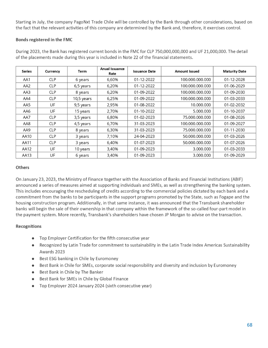 68 Starting in July, the company PagoNxt Trade Chile will be controlled by the Bank through other considerations, based on the fact that the relevant activities of this company are determined by the Bank and, therefore, it exercises control. Bonds registered in the FMC During 2023, the Bank has registered current bonds in the FMC for CLP 750,000,000,000 and UF 21,000,000. The detail of the placements made during this year is included in Note 22 of the financial statements. Maturity Date Amount Issued Issuance Date Anual Issuance Rate Term Currency Series 01 - 12 - 2028 100.000.000.000 01 - 12 - 2022 6,60% 6 years CLP AA1 01 - 06 - 2029 100.000.000.000 01 - 12 - 2022 6,20% 6,5 years CLP AA2 01 - 09 - 2030 100.000.000.000 01 - 09 - 2022 6,20% 8 years CLP AA3 01 - 03 - 2033 100.000.000.000 01 - 09 - 2022 6,25% 10,5 years CLP AA4 01 - 02 - 2032 10.000.000 01 - 08 - 2022 2,95% 9,5 years UF AA5 01 - 10 - 2037 5.000.000 01 - 10 - 2022 2,70% 15 years UF AA6 01 - 08 - 2026 75.000.000.000 01 - 02 - 2023 6,80% 3,5 years CLP AA7 01 - 09 - 2027 100.000.000.000 31 - 03 - 2023 6,70% 4,5 years CLP AA8 01 - 11 - 2030 75.000.000.000 31 - 03 - 2023 6,30% 8 years CLP AA9 01 - 03 - 2026 50.000.000.000 24 - 04 - 2023 7,10% 3 years CLP AA10 01 - 07 - 2026 50.000.000.000 01 - 07 - 2023 6,40% 3 years CLP AA11 01 - 03 - 2033 3.000.000 01 - 09 - 2023 3,40% 10 years UF AA12 01 - 09 - 2029 3.000.000 01 - 09 - 2023 3,40% 6 years UF AA13 Others On January 23, 2023, the Ministry of Finance together with the Association of Banks and Financial Institutions (ABIF) announced a series of measures aimed at supporting individuals and SMEs, as well as strengthening the banking system. This includes encouraging the rescheduling of credits according to the commercial policies dictated by each bank and a commitment from the banks to be participants in the support programs promoted by the State, such as Fogape and the housing construction program. Additionally, in that same instance, it was announced that the Transbank shareholder banks will begin the sale of their ownership in that company within the framework of the so - called four - part model in the payment system. More recently, Transbank’s shareholders have chosen JP Morgan to advise on the transaction. Recognitions ● Top Employer Certification for the fifth consecutive year ● Recognized by Latin Trade for commitment to sustainability in the Latin Trade Index Americas Sustainability Awards 2023 ● Best ESG banking in Chile by Euromoney ● Best Bank in Chile for SMEs, corporate social responsibility and diversity and inclusion by Euromoney ● Best Bank in Chile by The Banker ● Best Bank for SMEs in Chile by Global Finance ● Top Employer 2024 January 2024 (sixth consecutive year)
