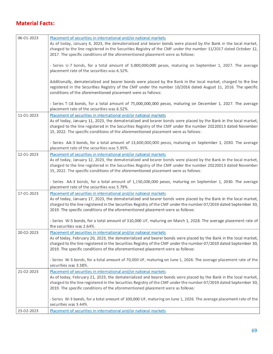 69 Material Facts: Placement of securities in international and/or national markets As of today, January 6 , 2023 , the dematerialized and bearer bonds were placed by the Bank in the local market, charged to the line registered in the Securities Registry of the CMF under the number 11 / 2017 dated October 12 , 2017 . The specific conditions of the aforementioned placement were as follows : - Series U - 7 bonds, for a total amount of 3 , 000 , 000 , 000 pesos, maturing on September 1 , 2027 . The average placement rate of the securities was 6 . 52 % . Additionally, dematerialized and bearer bonds were placed by the Bank in the local market, charged to the line registered in the Securities Registry of the CMF under the number 10 / 2016 dated August 11 , 2016 . The specific conditions of the aforementioned placement were as follows : - Series T - 18 bonds, for a total amount of 75 , 000 , 000 , 000 pesos, maturing on December 1 , 2027 . The average placement rate of the securities was 6 . 52 % . 06 - 01 - 2023 Placement of securities in international and/or national markets As of today, January 11 , 2023 , the dematerialized and bearer bonds were placed by the Bank in the local market, charged to the line registered in the Securities Registry of the CMF under the number 20220013 dated November 15 , 2022 . The specific conditions of the aforementioned placement were as follows : - Series AA - 3 bonds, for a total amount of 13 , 600 , 000 , 000 pesos, maturing on September 1 , 2030 . The average placement rate of the securities was 5 . 95 % . 11 - 01 - 2023 Placement of securities in international and/or national markets As of today, January 12 , 2023 , the dematerialized and bearer bonds were placed by the Bank in the local market, charged to the line registered in the Securities Registry of the CMF under the number 20220013 dated November 15 , 2022 . The specific conditions of the aforementioned placement were as follows : - Series AA - 3 bonds, for a total amount of 1 , 150 , 000 , 000 pesos, maturing on September 1 , 2030 . The average placement rate of the securities was 5 . 79 % . 12 - 01 - 2023 Placement of securities in international and/or national markets As of today, January 17 , 2023 , the dematerialized and bearer bonds were placed by the Bank in the local market, charged to the line registered in the Securities Registry of the CMF under the number 07 / 2019 dated September 30 , 2019 . The specific conditions of the aforementioned placement were as follows : - Series W - 5 bonds, for a total amount of 310 , 000 UF, maturing on March 1 , 2028 . The average placement rate of the securities was 2 . 64 % . 17 - 01 - 2023 Placement of securities in international and/or national markets As of today, February 20 , 2023 , the dematerialized and bearer bonds were placed by the Bank in the local market, charged to the line registered in the Securities Registry of the CMF under the number 07 / 2019 dated September 30 , 2019 . The specific conditions of the aforementioned placement were as follows : - Series W - 3 bonds, for a total amount of 70 , 000 UF, maturing on June 1 , 2026 . The average placement rate of the securities was 3 . 38 % . 20 - 02 - 2023 Placement of securities in international and/or national markets As of today, February 21 , 2023 , the dematerialized and bearer bonds were placed by the Bank in the local market, charged to the line registered in the Securities Registry of the CMF under the number 07 / 2019 dated September 30 , 2019 . The specific conditions of the aforementioned placement were as follows : - Series W - 3 bonds, for a total amount of 100 , 000 UF, maturing on June 1 , 2026 . The average placement rate of the securities was 3 . 44 % . 21 - 02 - 2023 Placement of securities in international and/or national markets 23 - 02 - 2023