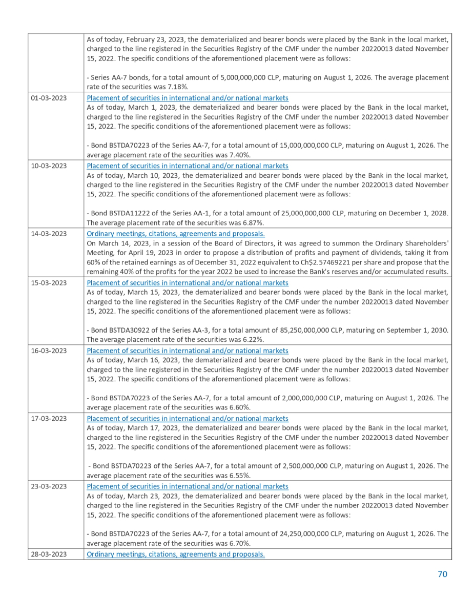 70 As of today, February 23 , 2023 , the dematerialized and bearer bonds were placed by the Bank in the local market, charged to the line registered in the Securities Registry of the CMF under the number 20220013 dated November 15 , 2022 . The specific conditions of the aforementioned placement were as follows : - Series AA - 7 bonds, for a total amount of 5 , 000 , 000 , 000 CLP, maturing on August 1 , 2026 . The average placement rate of the securities was 7 . 18 % . Placement of securities in international and/or national markets As of today, March 1 , 2023 , the dematerialized and bearer bonds were placed by the Bank in the local market, charged to the line registered in the Securities Registry of the CMF under the number 20220013 dated November 15 , 2022 . The specific conditions of the aforementioned placement were as follows : - Bond BSTDA 70223 of the Series AA - 7 , for a total amount of 15 , 000 , 000 , 000 CLP, maturing on August 1 , 2026 . The average placement rate of the securities was 7 . 40 % . 01 - 03 - 2023 Placement of securities in international and/or national markets As of today, March 10 , 2023 , the dematerialized and bearer bonds were placed by the Bank in the local market, charged to the line registered in the Securities Registry of the CMF under the number 20220013 dated November 15 , 2022 . The specific conditions of the aforementioned placement were as follows : - Bond BSTDA 11222 of the Series AA - 1 , for a total amount of 25 , 000 , 000 , 000 CLP, maturing on December 1 , 2028 . The average placement rate of the securities was 6 . 87 % . 10 - 03 - 2023 Ordinary meetings, citations, agreements and proposals . On March 14 , 2023 , in a session of the Board of Directors, it was agreed to summon the Ordinary Shareholders' Meeting, for April 19 , 2023 in order to propose a distribution of profits and payment of dividends, taking it from 60 % of the retained earnings as of December 31 , 2022 equivalent to Ch $ 2 . 57469221 per share and propose that the remaining 40 % of the profits for the year 2022 be used to increase the Bank's reserves and/or accumulated results . 14 - 03 - 2023 Placement of securities in international and/or national markets As of today, March 15 , 2023 , the dematerialized and bearer bonds were placed by the Bank in the local market, charged to the line registered in the Securities Registry of the CMF under the number 20220013 dated November 15 , 2022 . The specific conditions of the aforementioned placement were as follows : - Bond BSTDA 30922 of the Series AA - 3 , for a total amount of 85 , 250 , 000 , 000 CLP, maturing on September 1 , 2030 . The average placement rate of the securities was 6 . 22 % . 15 - 03 - 2023 Placement of securities in international and/or national markets As of today, March 16 , 2023 , the dematerialized and bearer bonds were placed by the Bank in the local market, charged to the line registered in the Securities Registry of the CMF under the number 20220013 dated November 15 , 2022 . The specific conditions of the aforementioned placement were as follows : - Bond BSTDA 70223 of the Series AA - 7 , for a total amount of 2 , 000 , 000 , 000 CLP, maturing on August 1 , 2026 . The average placement rate of the securities was 6 . 60 % . 16 - 03 - 2023 Placement of securities in international and/or national markets As of today, March 17 , 2023 , the dematerialized and bearer bonds were placed by the Bank in the local market, charged to the line registered in the Securities Registry of the CMF under the number 20220013 dated November 15 , 2022 . The specific conditions of the aforementioned placement were as follows : - Bond BSTDA 70223 of the Series AA - 7 , for a total amount of 2 , 500 , 000 , 000 CLP, maturing on August 1 , 2026 . The average placement rate of the securities was 6 . 55 % . 17 - 03 - 2023 Placement of securities in international and/or national markets As of today, March 23 , 2023 , the dematerialized and bearer bonds were placed by the Bank in the local market, charged to the line registered in the Securities Registry of the CMF under the number 20220013 dated November 15 , 2022 . The specific conditions of the aforementioned placement were as follows : - Bond BSTDA 70223 of the Series AA - 7 , for a total amount of 24 , 250 , 000 , 000 CLP, maturing on August 1 , 2026 . The average placement rate of the securities was 6 . 70 % . 23 - 03 - 2023 Ordinary meetings, citations, agreements and proposals. 28 - 03 - 2023