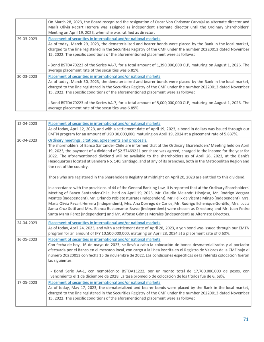 71 On March 28 , 2023 , the Board recognized the resignation of Oscar Von Chrismar Carvajal as alternate director and María Olivia Recart Herrera was assigned as independent alternate director until the Ordinary Shareholders’ Meeting on April 19 , 2023 , when she was ratified as director . Placement of securities in international and/or national markets As of today, March 29 , 2023 , the dematerialized and bearer bonds were placed by the Bank in the local market, charged to the line registered in the Securities Registry of the CMF under the number 20220013 dated November 15 , 2022 . The specific conditions of the aforementioned placement were as follows : - Bond BSTDA 70223 of the Series AA - 7 , for a total amount of 1 , 390 , 000 , 000 CLP, maturing on August 1 , 2026 . The average placement rate of the securities was 6 . 81 % . 29 - 03 - 2023 Placement of securities in international and/or national markets As of today, March 30 , 2023 , the dematerialized and bearer bonds were placed by the Bank in the local market, charged to the line registered in the Securities Registry of the CMF under the number 20220013 dated November 15 , 2022 . The specific conditions of the aforementioned placement were as follows : - Bond BSTDA 70223 of the Series AA - 7 , for a total amount of 5 , 000 , 000 , 000 CLP, maturing on August 1 , 2026 . The average placement rate of the securities was 6 . 85 % . 30 - 03 - 2023 Placement of securities in international and/or national markets As of today, April 12, 2023, and with a settlement date of April 19, 2023, a bond in dollars was issued through our EMTN program for an amount of USD 30,000,000, maturing on April 19, 2024 at a placement rate of 5.837%. 12 - 04 - 2023 Ordinary meetings, citations, agreements and proposals . The shareholders of Banco Santander - Chile are informed that at the Ordinary Shareholders' Meeting held on April 19 , 2023 , the payment of a dividend of $ 2 . 57469221 per share was agreed, charged to the income for the year for 2022 . The aforementioned dividend will be available to the shareholders as of April 26 , 2023 , at the Bank's Headquarters located at Bandera No . 140 , Santiago, and at any of its branches, both in the Metropolitan Region and the rest of the country . Those who are registered in the Shareholders Registry at midnight on April 20 , 2023 are entitled to this dividend . In accordance with the provisions of 44 of the General Banking Law, it is reported that at the Ordinary Shareholders' Meeting of Banco Santander - Chile, held on April 19 , 2023 , Mr . Claudio Melandri Hinojosa, Mr . Rodrigo Vergara Montes (Independent), Mr . Orlando Poblete Iturrate (Independent), Mr . Félix de Vicente Mingo (Independent), Mrs . María Olivia Recart Herrera (Independent), Mrs . Ana Dorrego de Carlos, Mr . Rodrigo Echenique Gordillo, Mrs . Lucia Santa Cruz Sutil and Mrs . Blanca Bustamante Bravo (Independent) were chosen as Directors ; and Mr . Juan Pedro Santa María Pérez (Independent) and Mr . Alfonso Gómez Morales (Independent) as Alternate Directors . 20 - 04 - 2023 Placement of securities in international and/or national markets As of today, April 24, 2023, and with a settlement date of April 28, 2023, a yen bond was issued through our EMTN program for an amount of JPY 10,500,000,000, maturing on April 28, 2024 at a placement rate of 0.60%. 24 - 04 - 2023 Placement of securities in international and/or national markets Con fecha de hoy, 16 de mayo de 2023 , se llevó a cabo la colocación de bonos desmaterializados y al portador efectuada por el Banco en el mercado local, con cargo a la línea inscrita en el Registro de Valores de la CMF bajo el número 20220013 con fecha 15 de noviembre de 2022 . Las condiciones específicas de la referida colocación fueron las siguientes : - Bond Serie AA - 1, con nemotécnico BSTDA11222, por un monto total de 17,700,000,000 de pesos, con vencimiento el 1 de diciembre de 2028. La tasa promedio de colocación de los títulos fue de 6.,68%. 16 - 05 - 2023 Placement of securities in international and/or national markets As of today, May 17 , 2023 , the dematerialized and bearer bonds were placed by the Bank in the local market, charged to the line registered in the Securities Registry of the CMF under the number 20220013 dated November 15 , 2022 . The specific conditions of the aforementioned placement were as follows : 17 - 05 - 2023