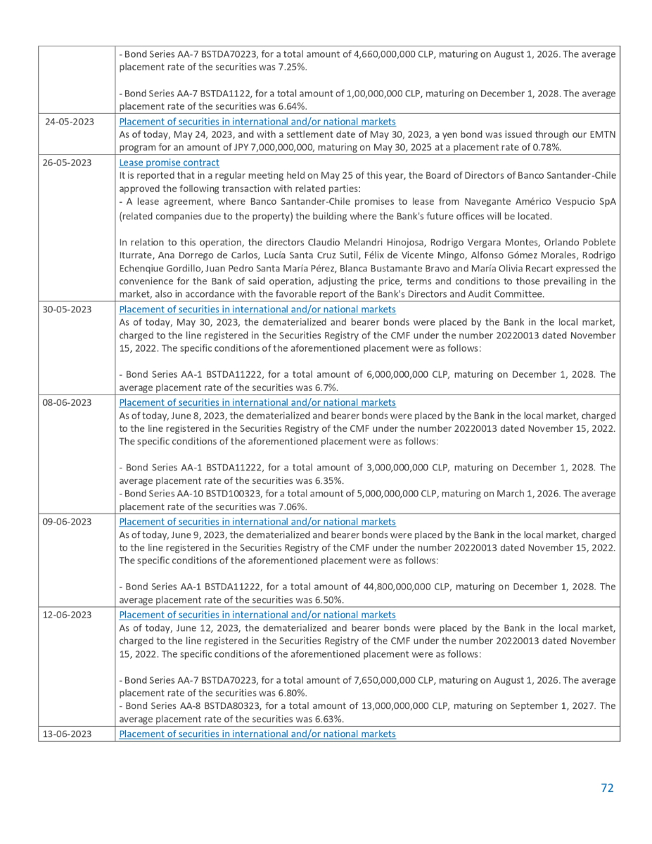 72 - Bond Series AA - 7 BSTDA70223, for a total amount of 4,660,000,000 CLP, maturing on August 1, 2026. The average placement rate of the securities was 7.25%. - Bond Series AA - 7 BSTDA1122, for a total amount of 1,00,000,000 CLP, maturing on December 1, 2028. The average placement rate of the securities was 6.64%. Placement of securities in international and/or national markets As of today, May 24, 2023, and with a settlement date of May 30, 2023, a yen bond was issued through our EMTN program for an amount of JPY 7,000,000,000, maturing on May 30, 2025 at a placement rate of 0.78%. 24 - 05 - 2023 Lease promise contract It is reported that in a regular meeting held on May 25 of this year, the Board of Directors of Banco Santander - Chile approved the following transaction with related parties: - A lease agreement, where Banco Santander - Chile promises to lease from Navegante Américo Vespucio SpA (related companies due to the property) the building where the Bank's future offices will be located. In relation to this operation, the directors Claudio Melandri Hinojosa, Rodrigo Vergara Montes, Orlando Poblete Iturrate, Ana Dorrego de Carlos, Lucía Santa Cruz Sutil, Félix de Vicente Mingo, Alfonso Gómez Morales, Rodrigo Echenqiue Gordillo, Juan Pedro Santa María Pérez, Blanca Bustamante Bravo and María Olivia Recart expressed the convenience for the Bank of said operation, adjusting the price, terms and conditions to those prevailing in the market, also in accordance with the favorable report of the Bank's Directors and Audit Committee . 26 - 05 - 2023 Placement of securities in international and/or national markets As of today, May 30 , 2023 , the dematerialized and bearer bonds were placed by the Bank in the local market, charged to the line registered in the Securities Registry of the CMF under the number 20220013 dated November 15 , 2022 . The specific conditions of the aforementioned placement were as follows : - Bond Series AA - 1 BSTDA 11222 , for a total amount of 6 , 000 , 000 , 000 CLP, maturing on December 1 , 2028 . The average placement rate of the securities was 6 . 7 % . 30 - 05 - 2023 Placement of securities in international and/or national markets As of today, June 8 , 2023 , the dematerialized and bearer bonds were placed by the Bank in the local market, charged to the line registered in the Securities Registry of the CMF under the number 20220013 dated November 15 , 2022 . The specific conditions of the aforementioned placement were as follows : - Bond Series AA - 1 BSTDA 11222 , for a total amount of 3 , 000 , 000 , 000 CLP, maturing on December 1 , 2028 . The average placement rate of the securities was 6 . 35 % . - Bond Series AA - 10 BSTD 100323 , for a total amount of 5 , 000 , 000 , 000 CLP, maturing on March 1 , 2026 . The average placement rate of the securities was 7 . 06 % . 08 - 06 - 2023 Placement of securities in international and/or national markets As of today, June 9 , 2023 , the dematerialized and bearer bonds were placed by the Bank in the local market, charged to the line registered in the Securities Registry of the CMF under the number 20220013 dated November 15 , 2022 . The specific conditions of the aforementioned placement were as follows : - Bond Series AA - 1 BSTDA 11222 , for a total amount of 44 , 800 , 000 , 000 CLP, maturing on December 1 , 2028 . The average placement rate of the securities was 6 . 50 % . 09 - 06 - 2023 Placement of securities in international and/or national markets As of today, June 12 , 2023 , the dematerialized and bearer bonds were placed by the Bank in the local market, charged to the line registered in the Securities Registry of the CMF under the number 20220013 dated November 15 , 2022 . The specific conditions of the aforementioned placement were as follows : - Bond Series AA - 7 BSTDA 70223 , for a total amount of 7 , 650 , 000 , 000 CLP, maturing on August 1 , 2026 . The average placement rate of the securities was 6 . 80 % . - Bond Series AA - 8 BSTDA 80323 , for a total amount of 13 , 000 , 000 , 000 CLP, maturing on September 1 , 2027 . The average placement rate of the securities was 6 . 63 % . 12 - 06 - 2023 Placement of securities in international and/or national markets 13 - 06 - 2023